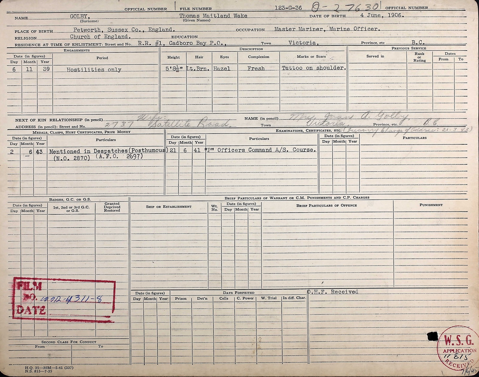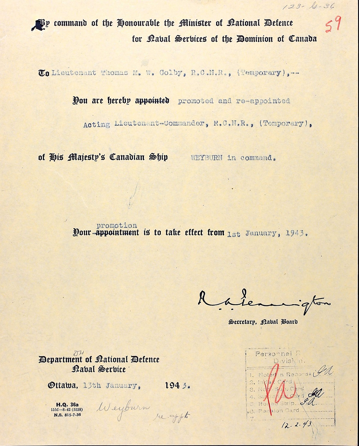 Ships served in: HMCS NADEN - Enlisted 06 Nov 1939 as an A/Lt, RCNR. LCdr Golby's record of service shows 03 Nov 1939 as date he enlisted, however, his attestation form (not included here) has 06 Nov 1939. The date from his attestation form has been used here. HMCS CRUSADER - Appointed to CRUSADER 30 Mar 1940 as an A/Lt, RCNR, CO - Appointment cancelled. Appointed to INVADER. HMCS INVADER - Appointed to INVADER 30 Mar 1940 as an A/Lt, RCNR, CO HMCS COUGAR - Appointed to COUGAR 20 Aug 1940 as an A/Lt, RCNR. Appointed Lt, RCNR 03 Nov 1940 HMCS HAMILTON - Appointed to HAMILTON 01 Jul 1941 as a Lt, RCNR HMCS WEYBURN - Appointed to WEYBURN 03 Nov 1941 at a Lt, RCNR. Appointed CO on commissioning. Appointed A/LCdr 01 Jan 1943