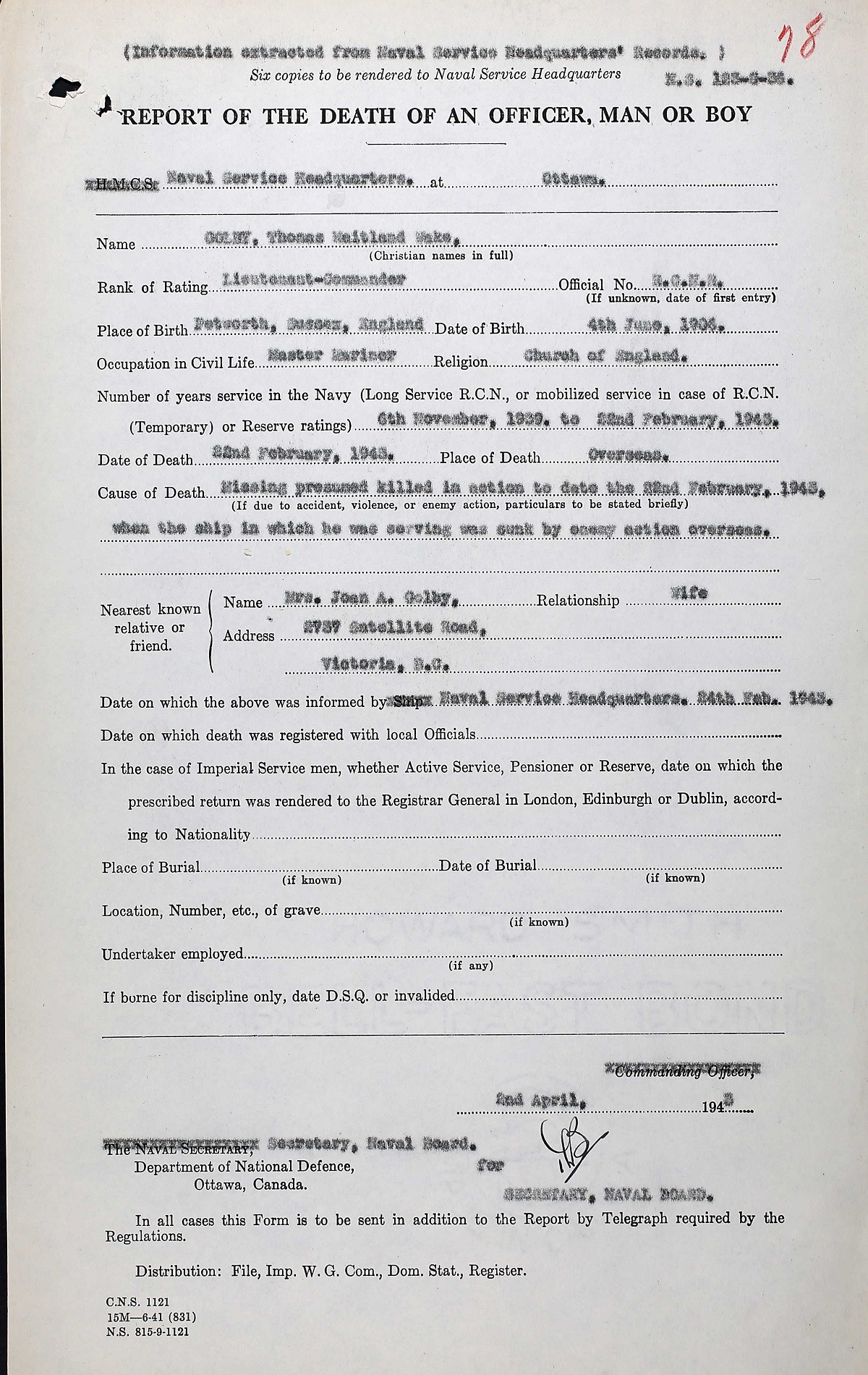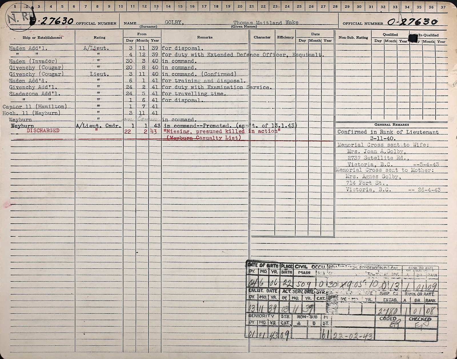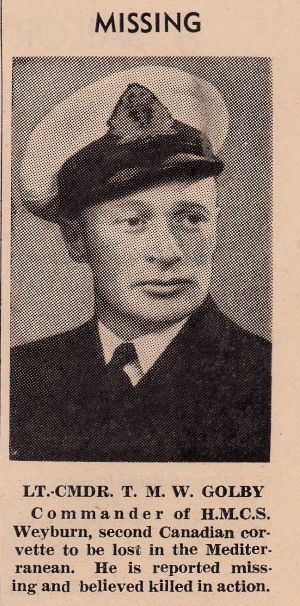 GOLBY, Thomas Maitland Wake, LCdr, RCNR, MPK - 22 Feb 1943, HMCS WEYBURN - Son of Agnes Golby of Victoria, British Columbia. Husband of Joan A. Golby, of Victoria, British Columbia.