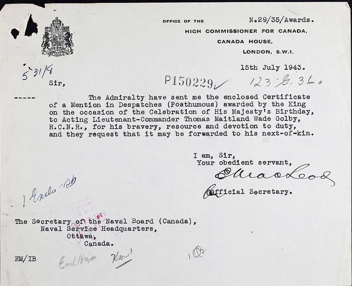 (TGF05-TG06) Cover letter and letter to LCdr Golby's wife for his award of Mentioned in Despatches (Posthumous)