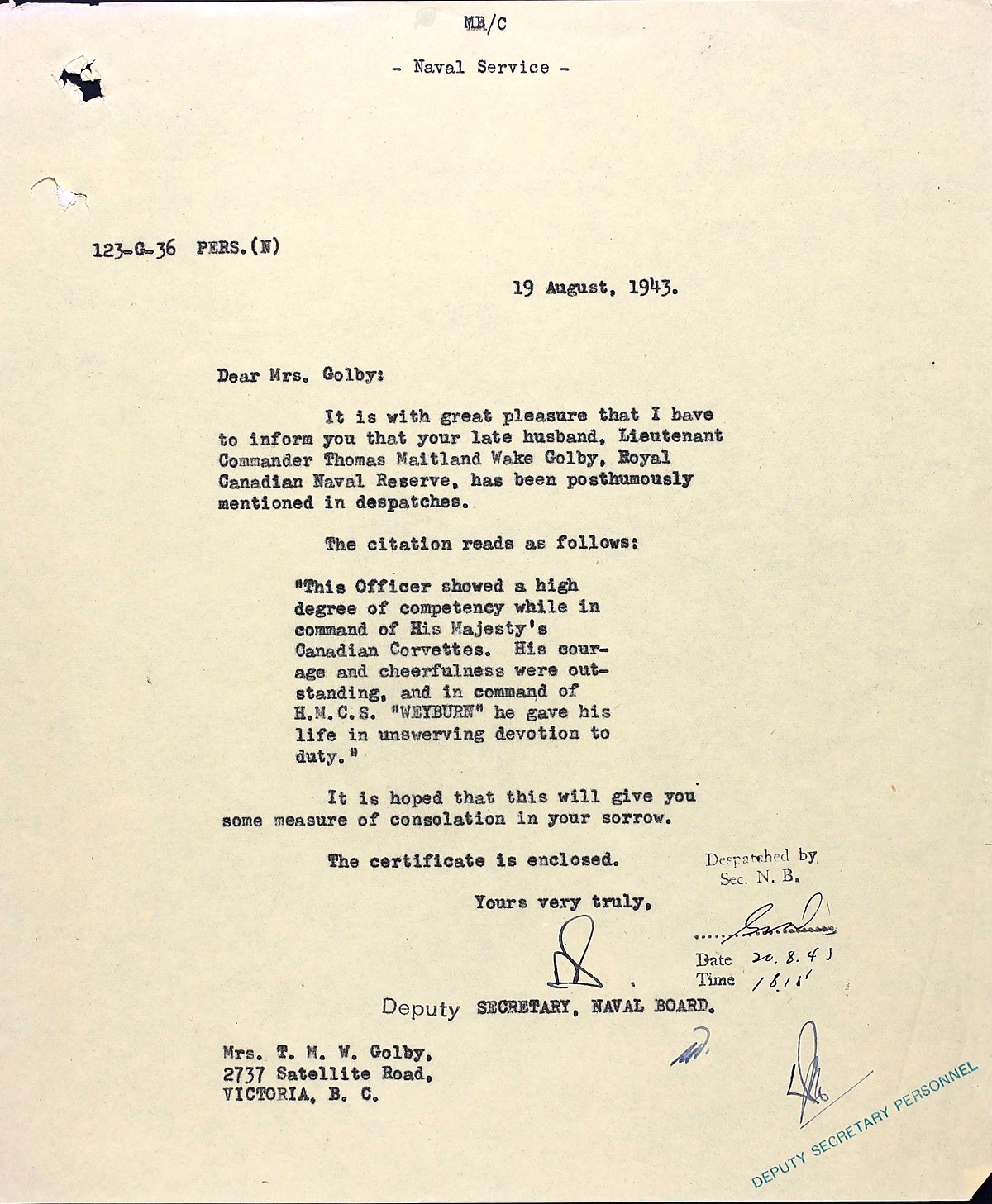 GOLBY, Thomas Maitland Wade, Acting Lieutenant-Commander, Mention in Despatches (Posthumous), RCNR, HMCS WEYBURN - Awarded as per Canada Gazette of 5 June 1943 and London Gazette of 2 June 1943.