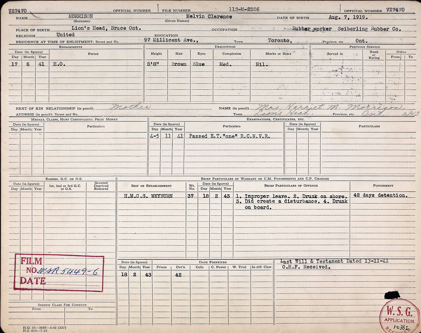 Ships served in: TORONTO DIVISION RCNVR - Enlisted 17 Jun 1941. Commenced Active Service 07 Aug 1941 HMCS WEYBURN - Drafted to WEYBURN 27 Jan 1942 as a Sto 2c, RCNVR. Rated Sto 1c 20 May 1942.