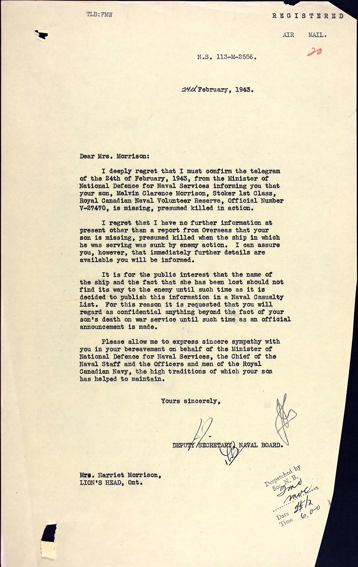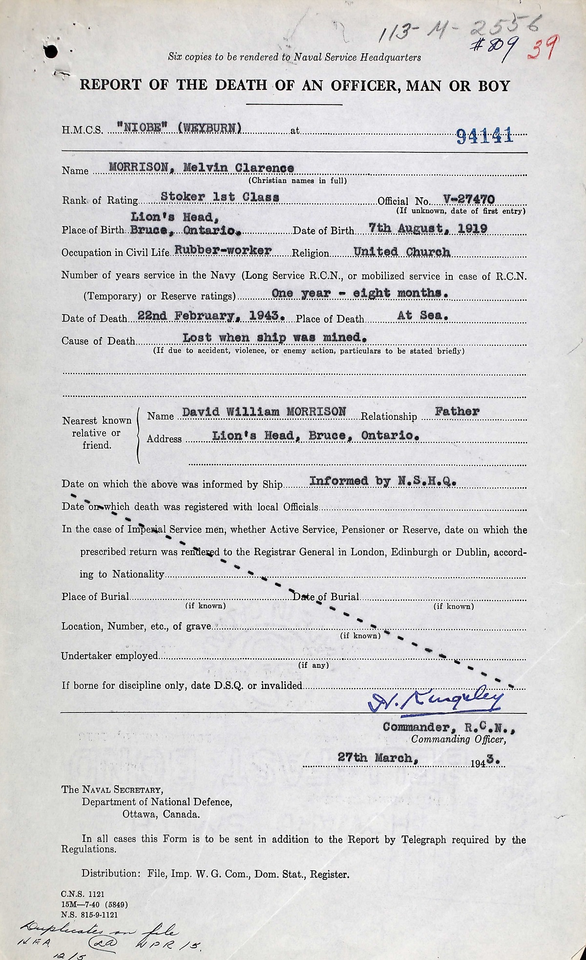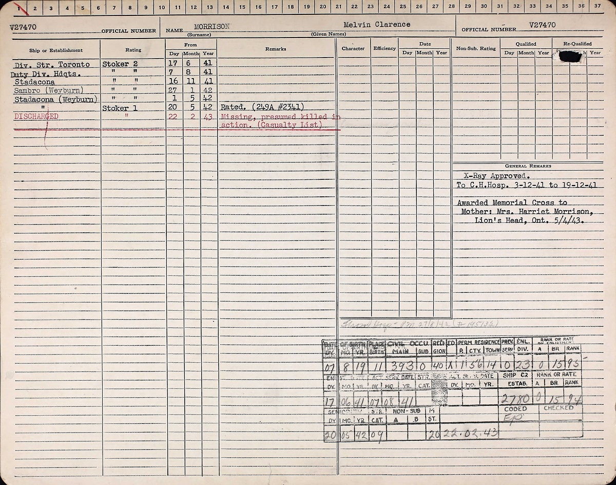 MORRISON, Melvin Clarence, Sto 1c, V27470, RCNVR, MPK - 22 Feb 1943, HMCS WEYBURN - Son of David William and Harriet Morrison, of Lions Head, Ontario.