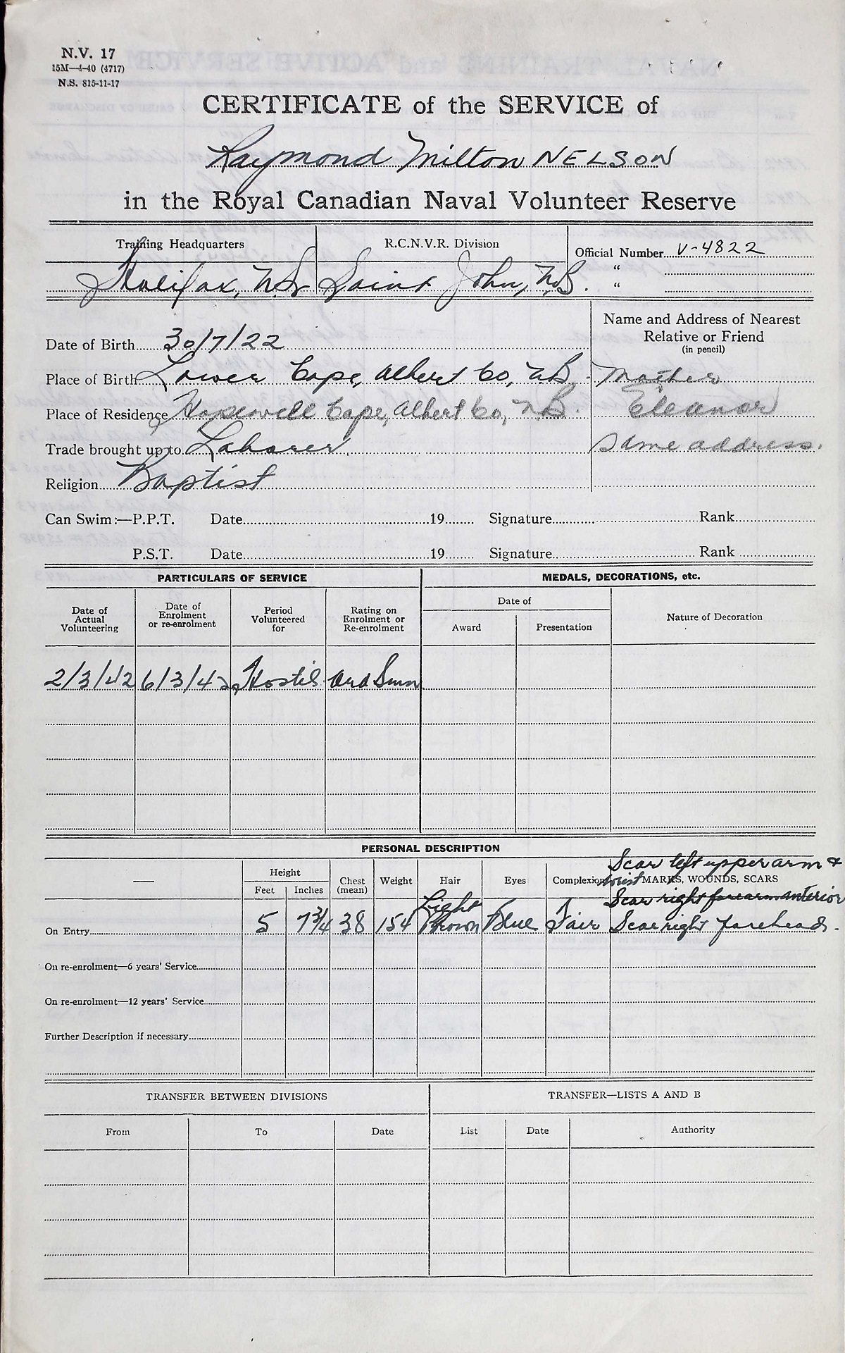 NELSON, Raymond Milton, AB, V4822, RCNVR, died - 02 Jun 1943, HMCS ARLEUX - Son of Percy R. Nelson and Eleanore Nelson, of Hopewell Cape.