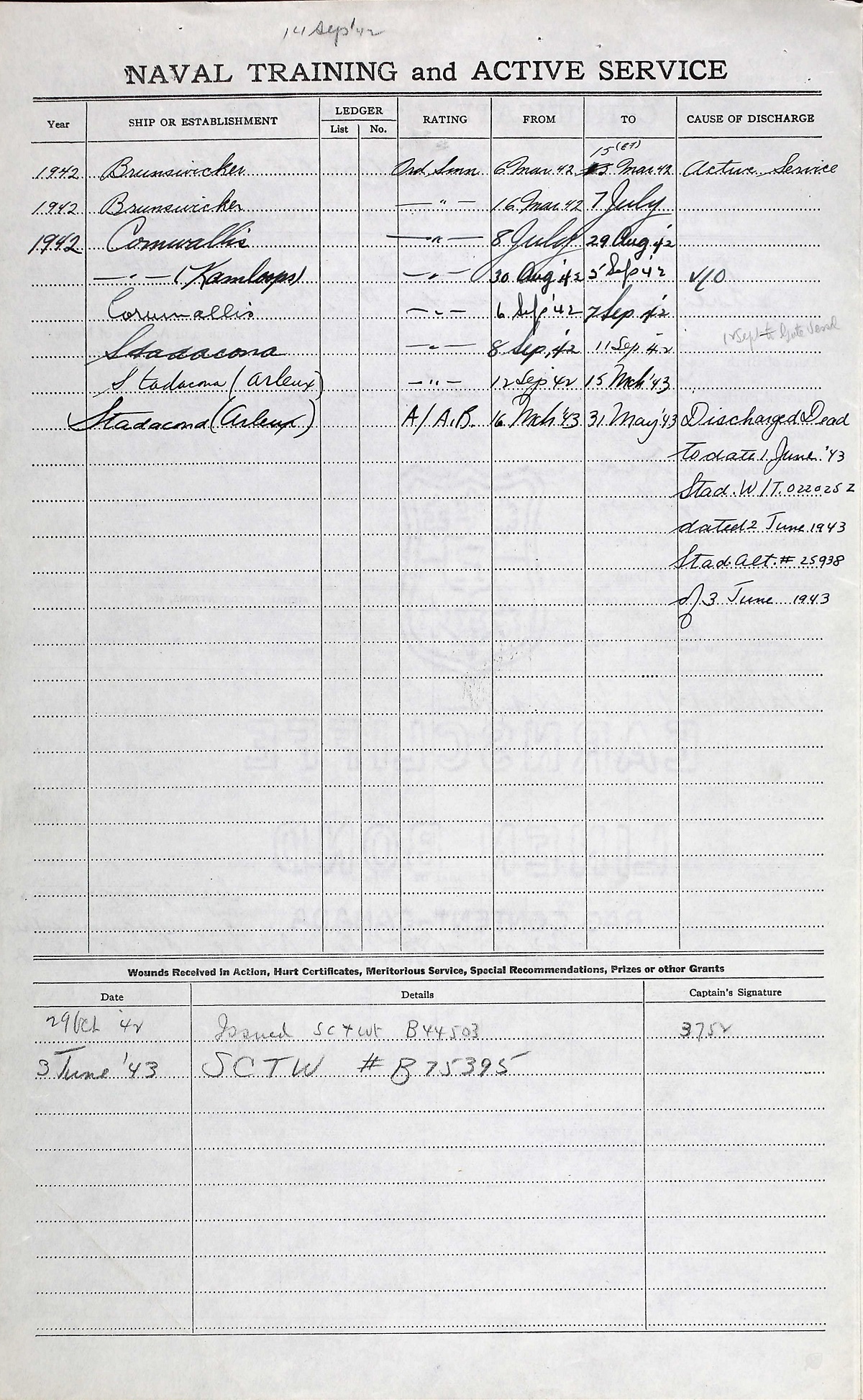 Ships served in: HMCS BRUNSWICKER - Enlisted 06 Mar 1942. Commenced Active Service 16 Mar 1942 HMCS KAMLOOPS - Served in KAMLOOPS 30 Aug 1942 - 05 Sep 1942 while in training at HMCS CORNWALLIS, Halifax, NS HMCS ARLEUX - Drafted to ARLEUX 12 Sep 1942 as an OS RCNVR. Rated A/AB 16 Mar 1943