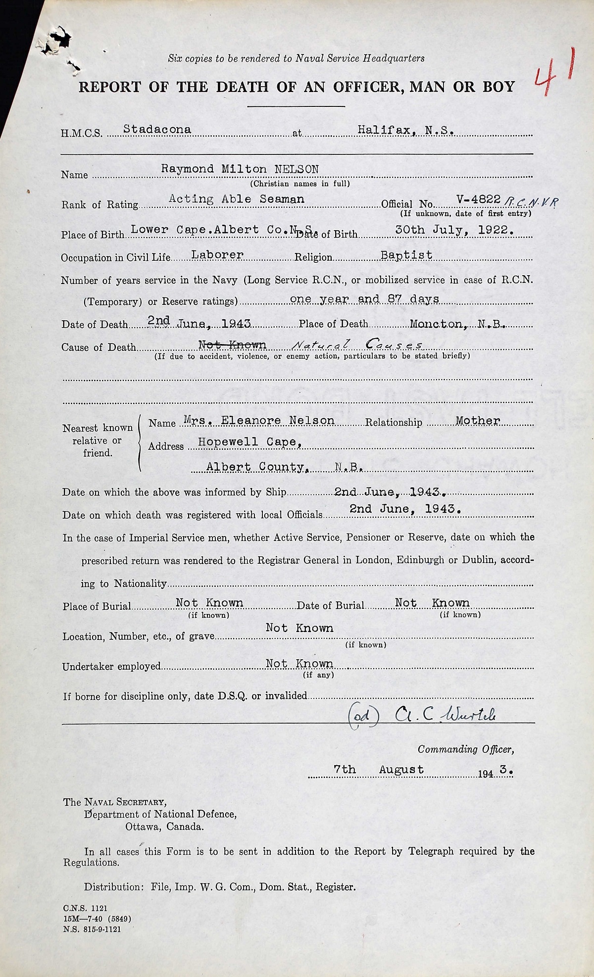AB Nelson died of natural causes (heart blockage) while on leave in Moncton, NB. He is buried in the Mountain View Cemetery, Lower Cape, New Brunswick