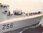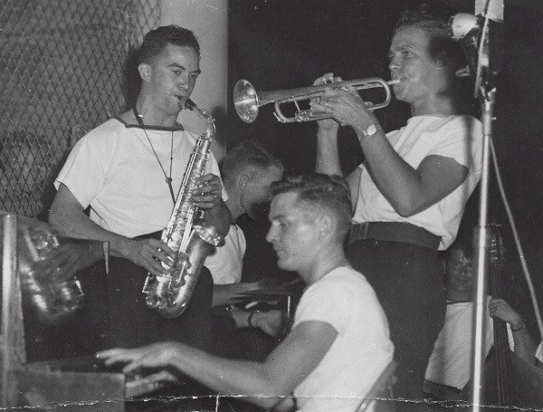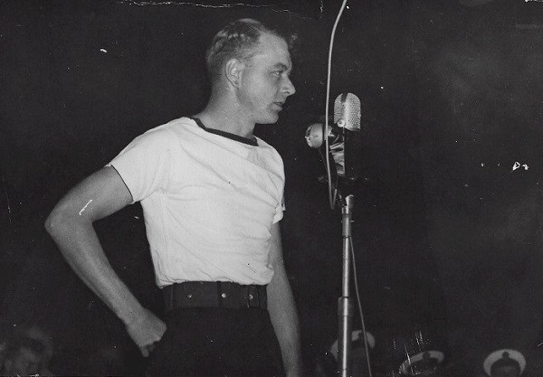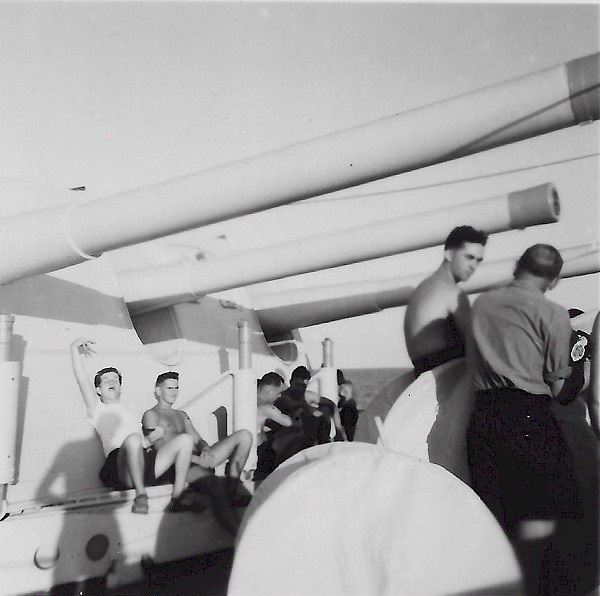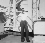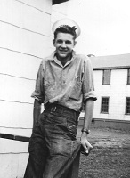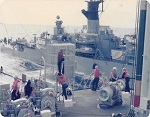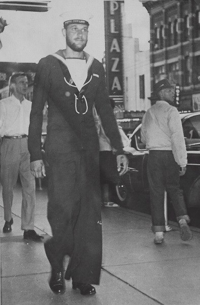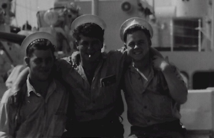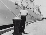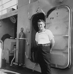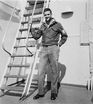 (SH85) Jake Balfour (6'6") and Steve Hlasny (6'5") ready to go ashore in San Diego, CA during a port visit by HMCS JONQUIERE - 1955 (SH86) Norman Bone in the whaler on HMCS JONQUIERE (SH87) Spud Larter on HMCS JONQUIERE (SH88) Up Spirits - Quarterdeck of HMCS JONQUIERE 318 - 1955. Front row first on left, ABQM Carl Jensen; 4th from left LSRP Jim McTavish; Front right corner LSRC John (Ike) Templeton. Back row 2nd from the left, LSRP S. Hlasny; 3rd from the left LSLR Harry Reynolds