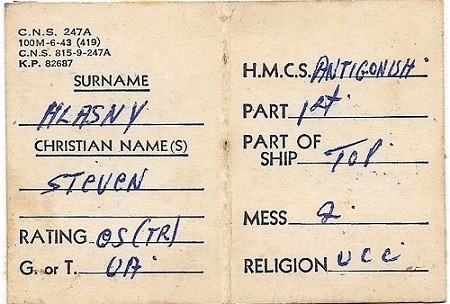 Steve was born in Drumheller, Alberta and educated in Newcastle, and Drumheller in the Drumheller Valley. He joined the Royal Canadian Navy on May 17, 1951 as an Ordinary Seamen and took new entry training at HMCS CORNWALLIS. On completion of new entry training, he was drafted to HMCS STADACONA temporary waiting for his draft to HMCS WALLACEBURG, an Algerine class minesweeper, for seamanship training. On completion of his training he was then drafted to HMCS NADEN awaiting for his next draft to sea on HMCS ANTIGONISH. His request for entry into the Electrical became history as gun loaders were required for ships going on Korean deployment.