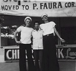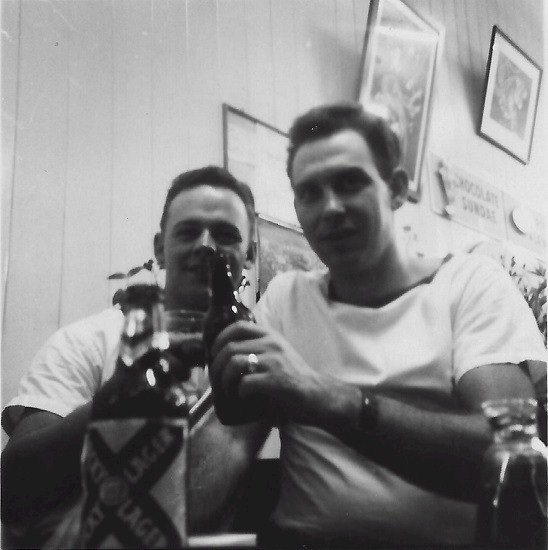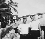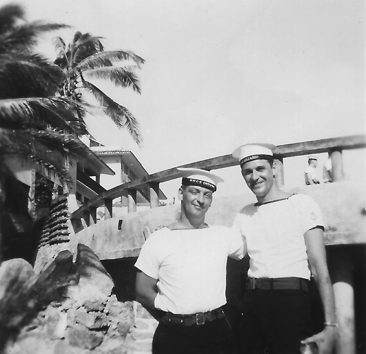 (SH94) Gord (left) and Charlie, EM's Club, Pearl Harbour - Spring Cruise (SH95) LS.RP Steve Hlasny at the beer gardens in Pearl Harbor, HI, Jan 1957 (SH96) Frigates in company - HMCS STETTLER and HMCS NEW GLASGOW - Spring Cruise 1957 (SH97) Sailors of HMCS ONTARIO at Capt. Cook's monument, Kealakahua, HI (SH98) Crew watching Hula troupe on HMCS ONTARIO at Hilo, HI