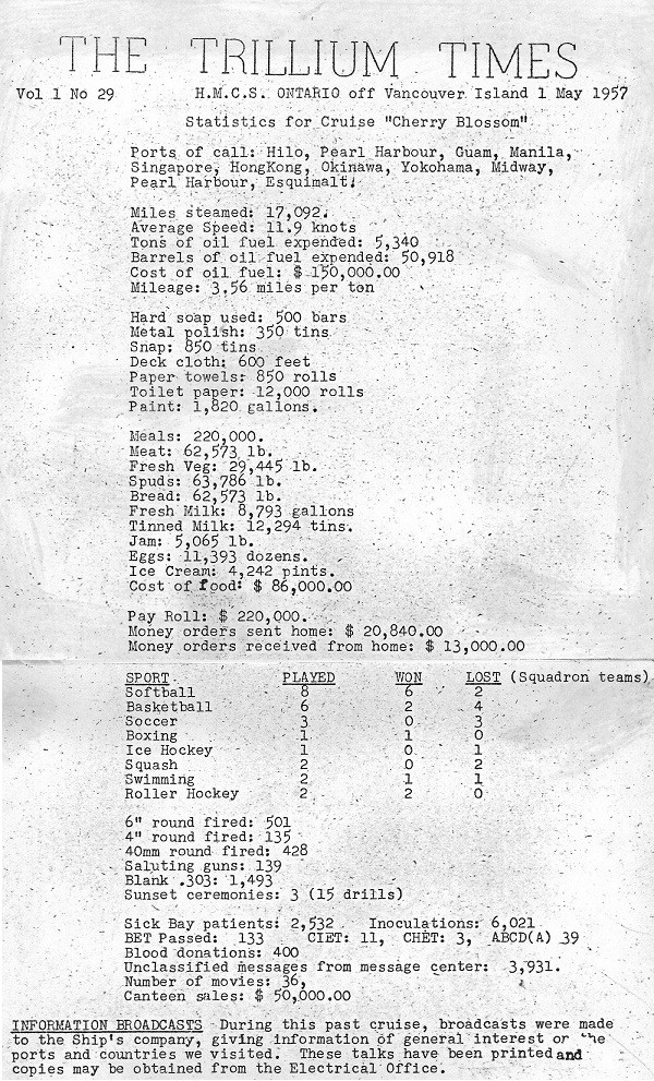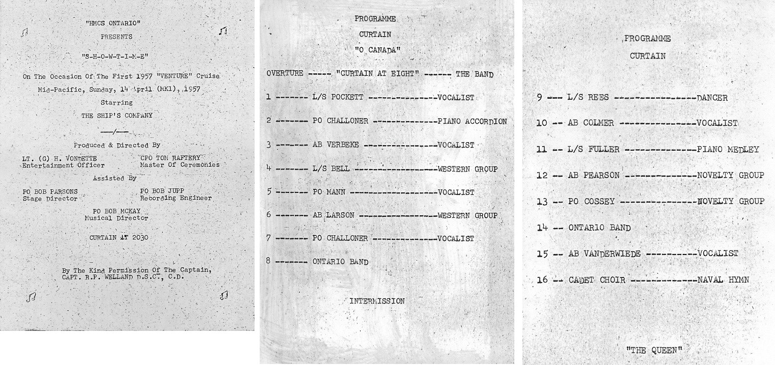(SH99) Hula troupe on HMCS ONTARIO at Hilo, Hawaii (SH100) Programme for "Showtime" on HMCS ONTARIO - 14 Apr 1957, Mid Pacific (SH101) Showtime on HMCS ONTARIO - Harvey Parsons (left) and Lt (G) H. Vondette (SH102) Showtime on HMCS ONTARIO - Bob Parsons (SH103) Showtime on HMCS ONTARIO - L-R - Harvey, Gerry McLean, Dinger Bell