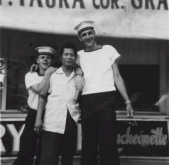 (SH112) Film actress Rosa Rosal on board HMCS ONTARIO at Manila with crew members of HMCS JONQUIERE (SH113) Blood donor clinic on board HMCS ONTARIO at Manila (SH114) Henderson (left), Steve Hlasny (right) in Manila (SH115) Dinger Bell (left), Steve Hlasny (right) in Manila (SH116) LSRP Dinger Bell and LSrp Steve Hlasny, HMCS ONTARIO, with ABRP Gord Henderson, HMCS Stettler, Manila, 1957