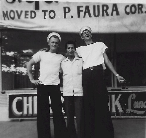 (SH468) Kowloon - May 1983 (SH469) Floating restaurant at Aberdeen, Hong Kong. Duncan, Olsen, Hlasny, Reeves, Sullivan (SH470) Exercise Far Horizon 1983 - 7th leg of the trip. Port Visit Manila, Philippines - 25-28 May 1983 (SH471) Decorative shuttle taxis, Manila, Philippines, May 1983 (SH472) Steve Hlasny and Bill Tindell with their shopping hosts - PO1 Pilar H Pojol, CPO Elu, Manila, Philippines, May 1983
