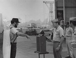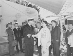 (SH380) At sea on HMCS MACKENZIE - Lt Morrison, Ken Irvine, Howie Kolson (SH381) At sea on HMCS MACKENZIE - Barry Stewart, Ken Irvine (SH382) HMCS MACKENZIE (foreground) going up the Sacramento River. Max at the hatch (SH383) Ken Irvine receiving his C1s. HMCS MACKENZIE - at sea (SH384) Doug Miller receiving his C1s. HMCS MACKENZIE - at sea