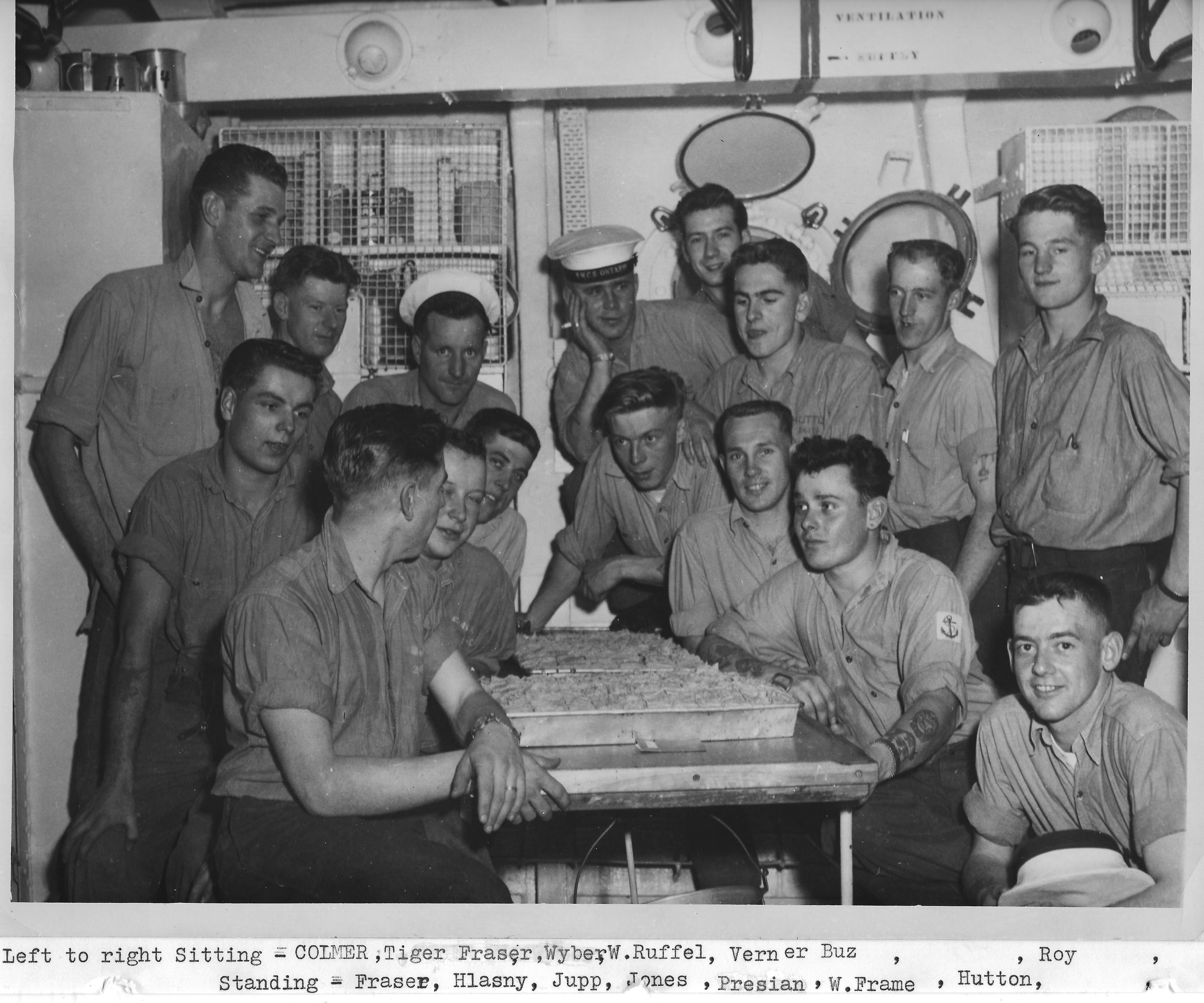 (SH122) Crew members of HMCS ONTARIO - April 1957. Cake for the cleanest mess - heading home to Esquimalt // (1) Fraser (2) Colmer (3) Tiger Fraser (4) Wyber (5) W. Ruffel (6) Verner Buz (7) unknown (8) Roy (9) Steve Hlasny (10) Jupp (11) Jones (12) Presian (13) W. Frame (14) Hutton (15) unknown (16) unknown // Click here to see the photo with everyone numbered (SH123) The Trillium Times - HMCS ONTARIO shipboard newspaper - Stats for the 1957 Spring Cruise (SH124) Crossing the Line wallet card - Steve Hlasny (SH125) Ma-Day, Fergy, Webster (SH126) Unknown sailor with Steve Hlasny (right) - July 1957