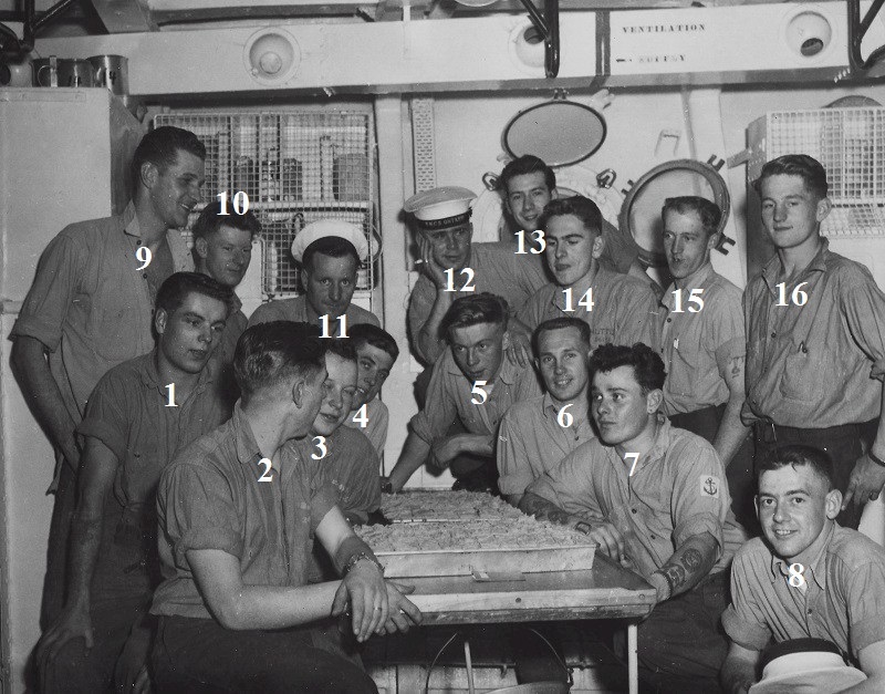 (SH75) Spud Larter and MacDonald on HMCS JONQUIERE (SH76) Spud Larter, Pearl Harbour, 1955 (SH77) Steve Hlasny, serving in HMCS JNQUIERE, ashore in Vancouver (SH78) Steve Hlasny "Days of Wine and Roses" on HMCS JONQUIERE (SH79) Sailors on the quarterdeck of HMCS JONQUIERE (1) unknown, (2) Don Little, (3) Chester, (4) unknown, (5) Steve Hlasny, (6) Spud Larter, (7) Mann, (8) George Goossen, (9) unknown, (10) John Davies, (11) unknown, (12) unknown (13) Jim Lyttle, (14) unknown, (15) unknown, (16) unknown - Click here to view the photo with everyone numbered