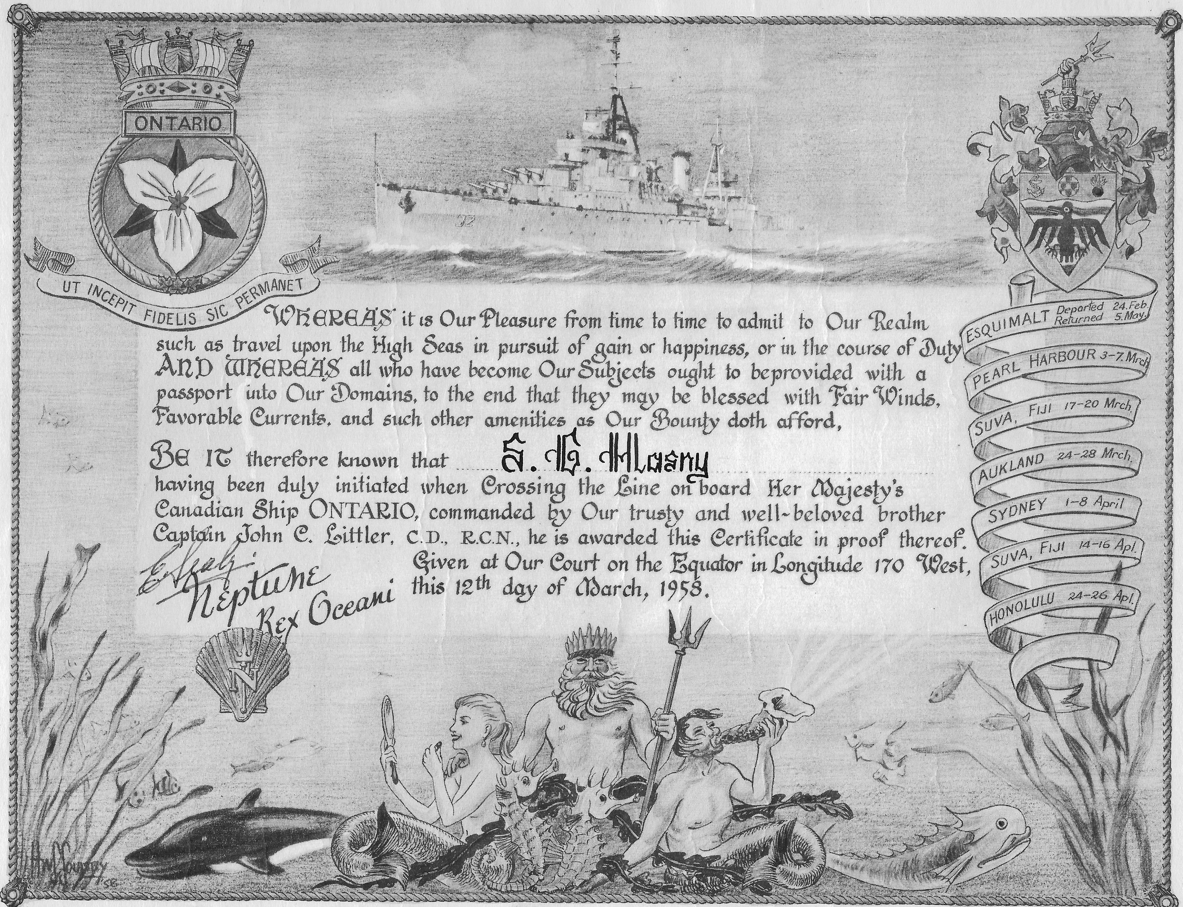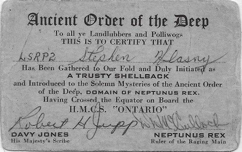 (SH142) Dave McKee, HMCS ONTARIO, Pearl Harbour, Hawaii - Mar 1958 (SH143) Steve Hlasny, HMCS ONTARIO, Pearl Harbour, Hawaii - Mar 1958 (SH144) The night before we "cross the line" on HMCS ONTARIO, 25 Feb 1957 (SH145) Crossing the Line, HMCS ONTARIO, March 1958 - Dramatis Personae (SH146) Crossing the Equator certificate, Steve Hlasny, HMCS ONTARIO, 12 March 1958