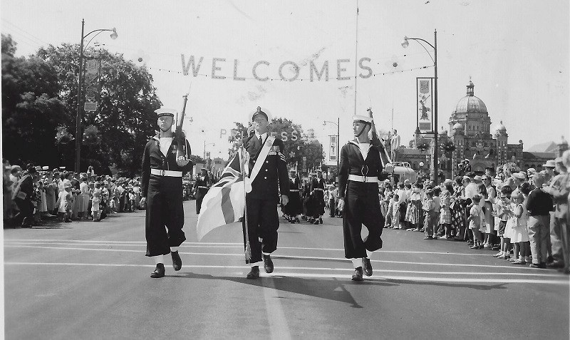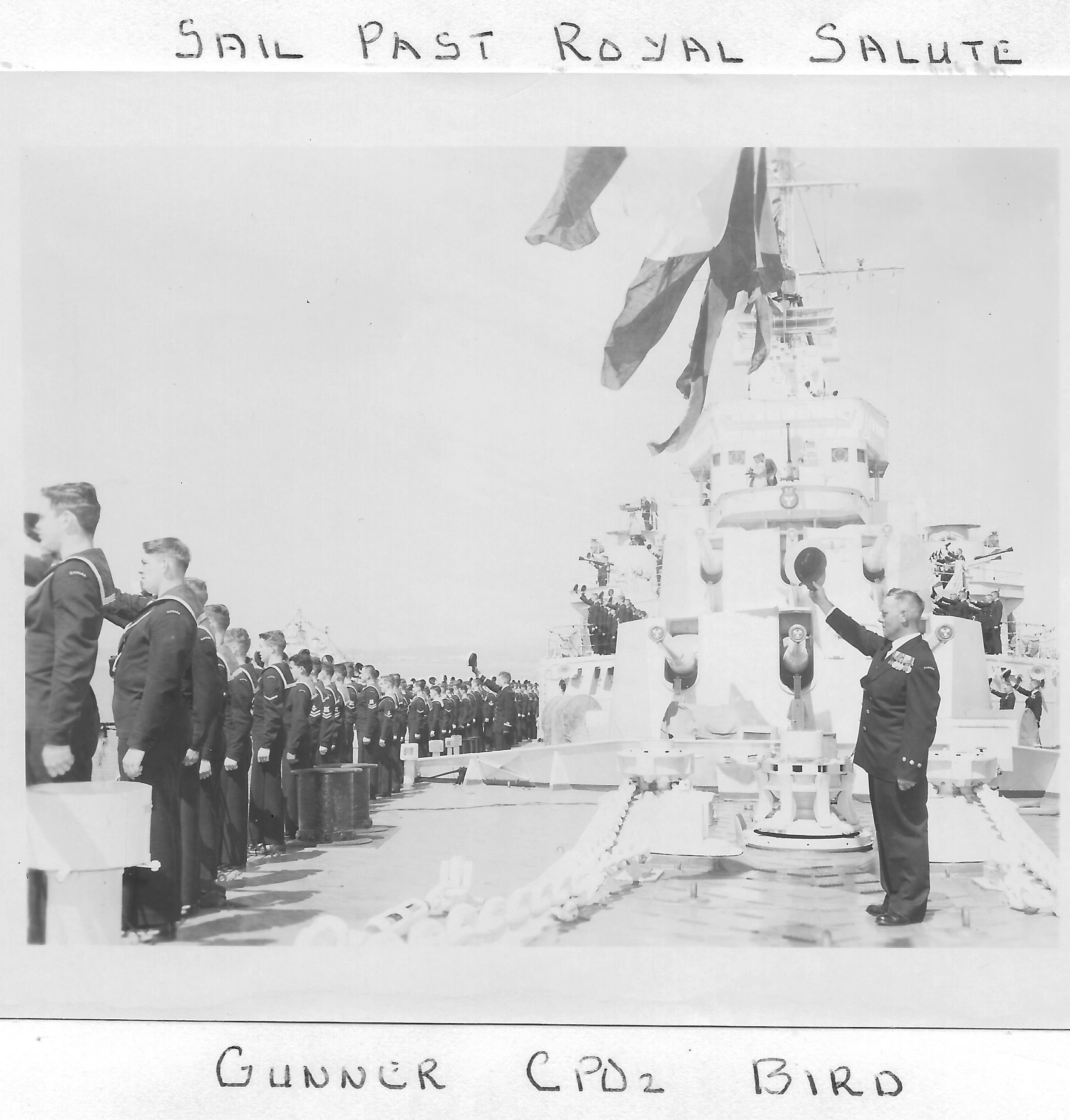 (SH162) 1958 BC Centennial. HMCS ONTARIO crew members (L-R) ??, PO1 Tuttle and Alec McLean (SH162) Princess Margaret's sailpast - the Royal Salute, 1958. Gunner, CPO2 Bird (SH164) Princess Margaret's sail past, 1958. CPO Bird on right (SH165) Royal Roads - ships lit up at night during Princess Margaret's visit, 1958 (SH166) HMCS ONTARIO enroute to English Bay with destroyer escort. HMCS ATHABASKAN 219 lead destroyer. Photo taken from HMCS ONTARIO