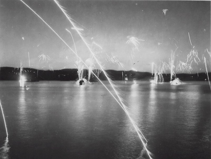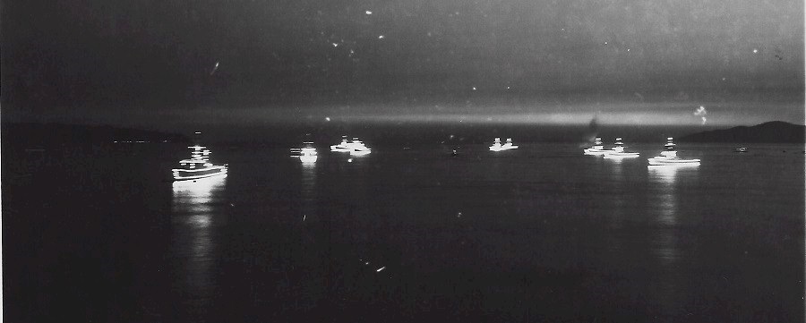 (SH167) HMCS ATHABASKAN 219, HMCS CRESCENT, (3rd ship unknown) escorting HMCS ONTARIO enroute to English Bay. Photo taken from HMCS ONTARIO (SH168) Night Illumination - the fleet is setting off fireworks in English Bay. Photo taken from HMCS ONTARIO (SH169) Night Illumination - the fleet is setting off fireworks in English Bay. Photo taken from HMCS ONTARIO (SH170) L-R: Steve Hlasny (ONTARIO) and Quinn (JONQUIERE). A last run ashore in Vancouver (SH171) Steve Hlasny - "A last run ashore in Vancouver. Beard comes off and I go on leave and tie the old knot"