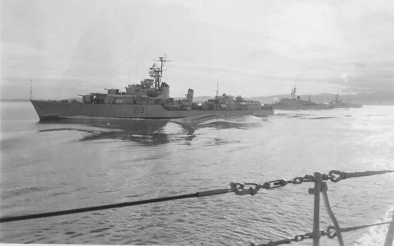 (SH219) HMCS QU'APPELLE exercising with RFA TIDEREACH (SH220) Fueling stations - Bill Shaw, Ken Irvine on right side of photo (SH221) Helo delivers mail to HMCS QU'APPELLE (SH222) HMNZS ANZAC, Sydney, Australia (SH223) HMCS SASKATCHEWAN, HMCS QU'APPELLE, HMCS ST CROIX, Garden Island Naval Base, Sydney, NSW, Australia