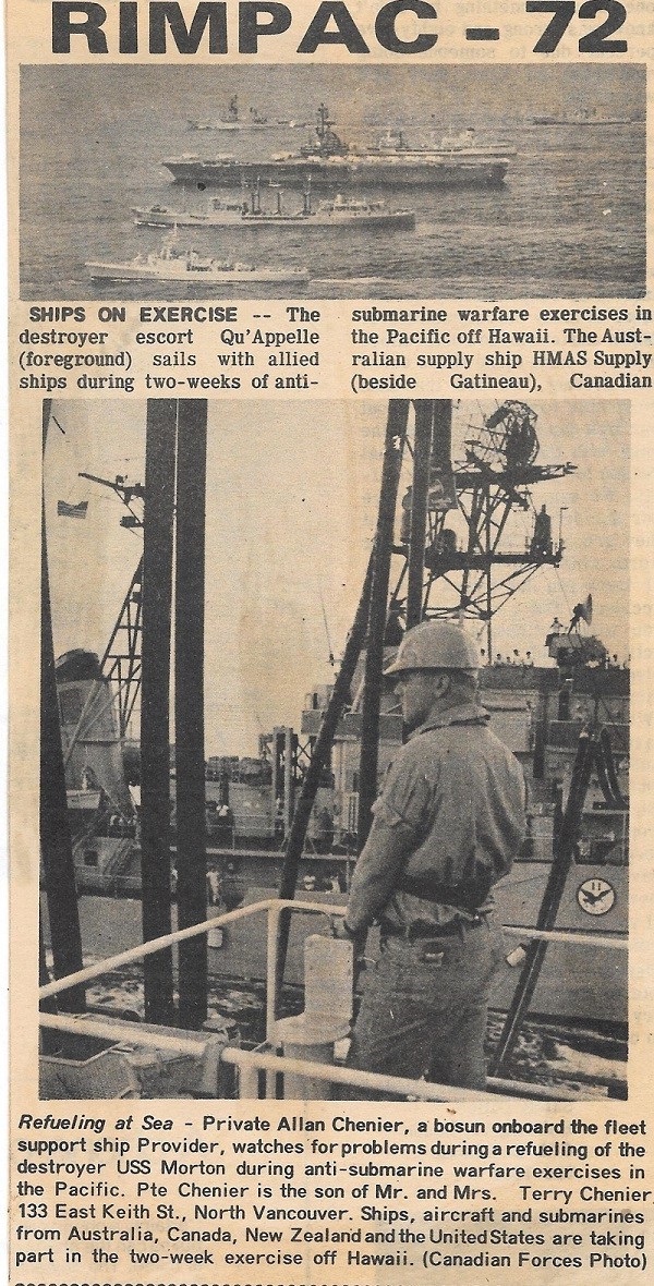 (SH228) Newspaper article on EX RIMPAC 72 (SH229) HMCS RESTIGOUCHE RAS with HMCS PROVIDER (SH230) USS TICONDEROGA (SH231) USS MORTON coming along side HMCS PROVIDER for a RAS (SH232) Dental truck on HMCS PROVIDER for EX RIMPAC 72. PO1 Ed sitting on the back of the truck