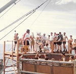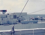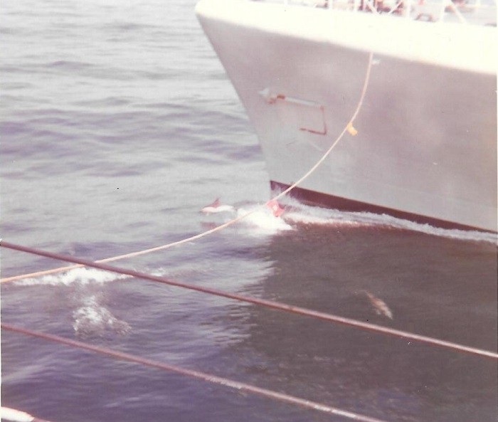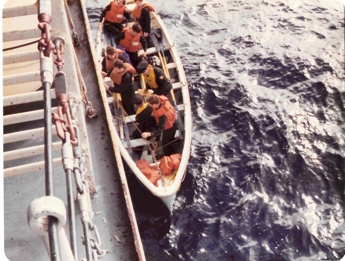 (SH473-SH476) Exercise Far Horizons 1983 - 8th leg of the trip - Manila to Pearl Harbor. At sea, enroute to Pearl Harbor after departing Manila - Hand to Bathe. Water temp 88 degrees Fahrenheit. The ship's boat was for safety and there was a marksman with a rifle on the bridge for sharks.