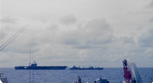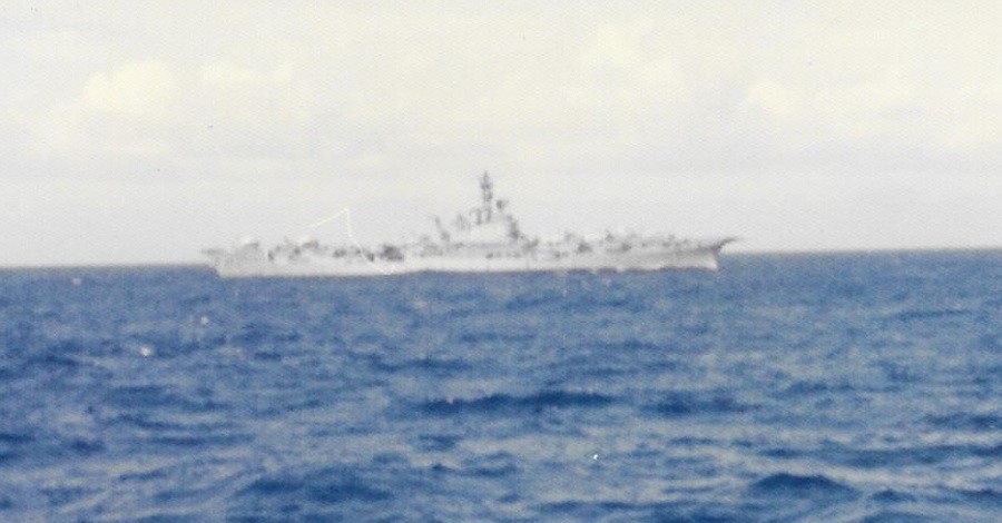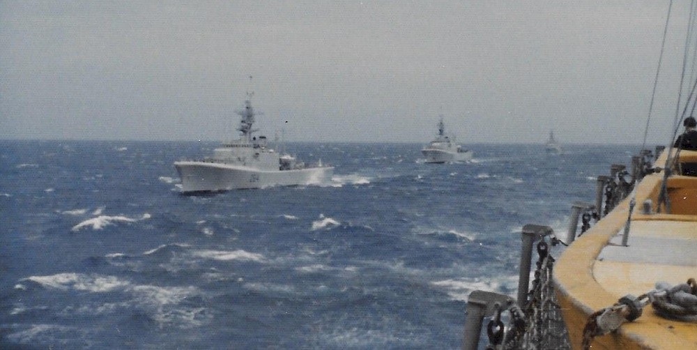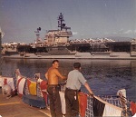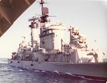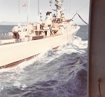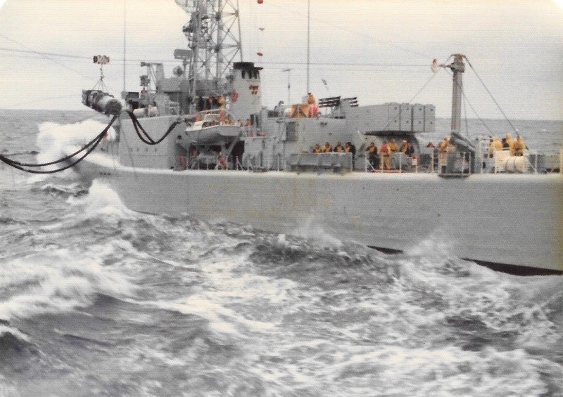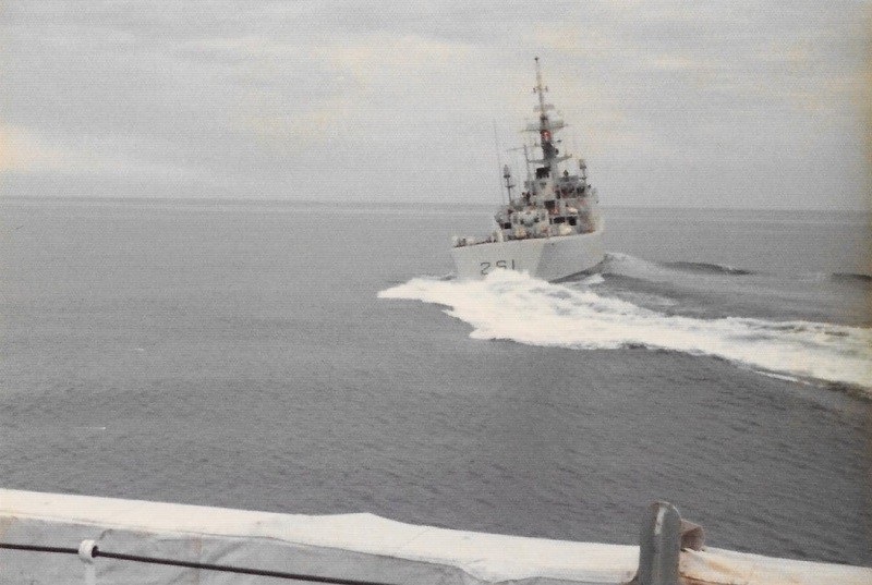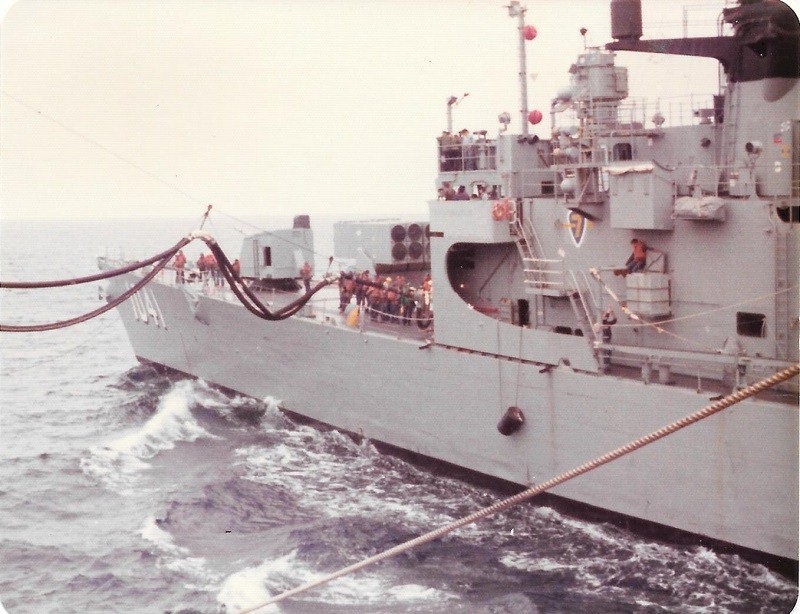 (SH413) USS Kansas City and aircraft carrier USS Coral Sea. Nose HMCS GATINEAU in the foreground - 1983 (SH414) Fueling the fleet enroute to Pearl Harbor - 1983. USS Kansas City refueling USS Coral Sea (SH415) HMCS GATINEAU arrives along STBD side of USS Kansas City for RAS. USS Coral Sea already RASing on the PORT side - 1983 (SH416) (Standing) J. Osmond, R. Young, P. Chmielewski, Ed Boulter on HMCS GATINEAU - 1983 (SH417) "Guns retires and flies home from Pearl Harbour". A mess dinner for Guns and presentation from the Chief and POs of HMCS GATINEAU - 1983