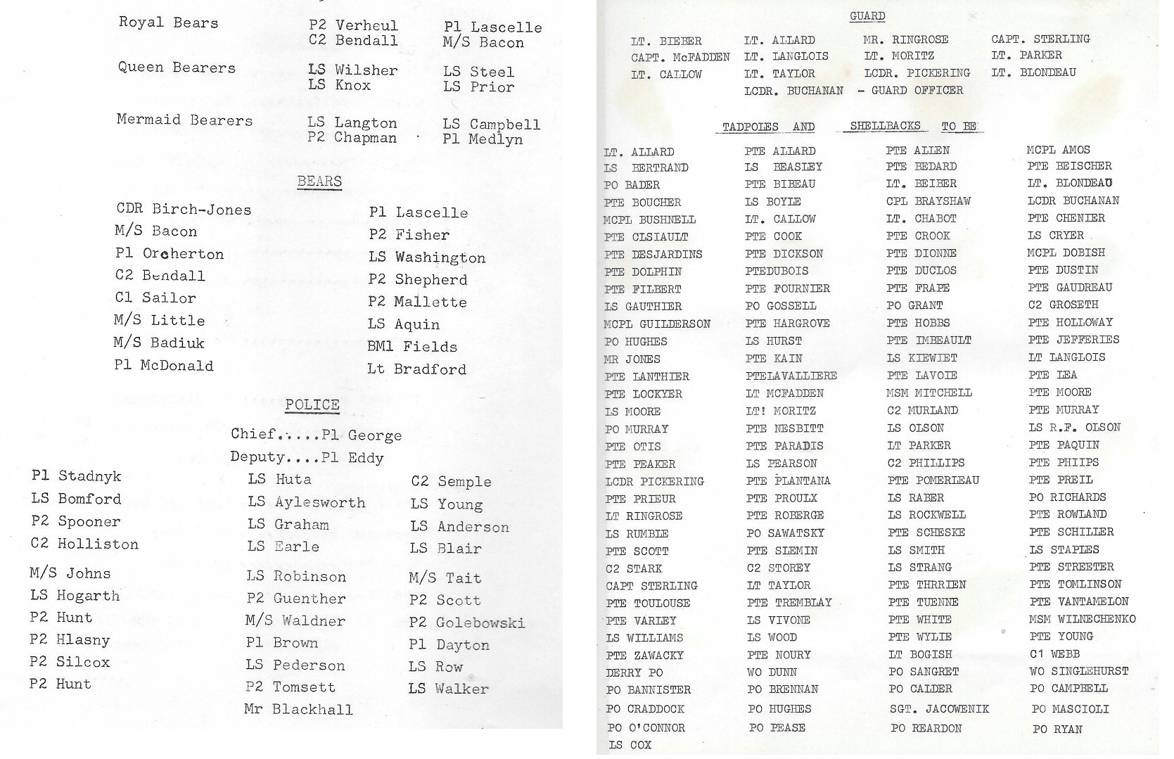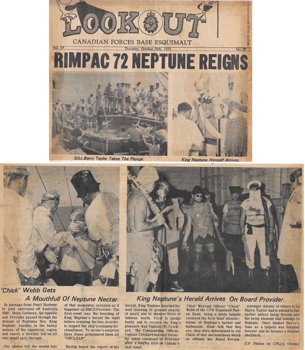 Crossing the Line on HMCS PROVIDER, 25 Sep 1972 - EX RIMPAC 72 (SH240) Sailors getting dunked (SH241 List of Neptune's Court and Tadpoles (SH243) Article from the Esquimalt LOOKOUT, 26 Oct 1972 on the Crossing the Line Ceremony on HMCS PROVIDER during EX RIMPAC 72