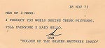 (SH346) Milt, Marsh, Nester on HMCS MACKENZIE, Nov 1978 (SH347-SH3489) Captain Hook Bi-Centennial, Apr 1978 (SH349) Lieut. Governor of BC invitation to HMCS MACKENZIE'S ship's company for a reception at Government House (SH350) HMCS MACKENZIE Christmas card - 1979