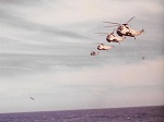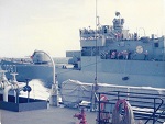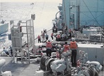(SH477) "My first Vertrep". Steve Hlasny gets hoisted aboard a helo off HMCS GATINEAU. "Earl and I get a ride into Pearl Harbor 1 day early" (SH478) HMCS GATINEAU (closest ship) (SH479) HMCS PROVIDER being screened by the ships of the 2nd Squadron (SH480) 3 Mess HMCS GATINEAU - Mike Burns, Henry Smith, Mike Eakins, Bob Dunn, Knobby Clarke, Earl Sorensen, Rich Staff, John Tata, Steve Hlasny, Doug Bullens, Bob Morrow and a token American (SH481) 11 Mess (Stoker`s Mess), HMCS GATINEAU in 1985