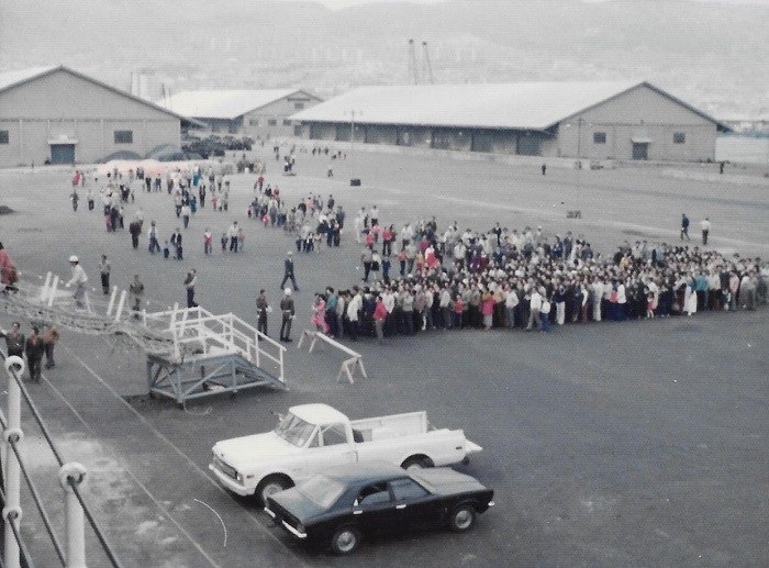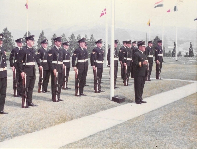 (SH458) Wreath laying ceremony - 13 May 1983. Wreath laying party representing Capt. George D2 (SH459) Wreath laying ceremony - 13 May 1983. Commanding officers of 2nd Sqn ships on the right. Gen Withers CDS, WIP's and D2 on the left (SH460) Wreath laying ceremony - 13 May 1983. General salute to the war dead (SH461) Port visit Chinhae, Korea 13-15 May 1983. Busing the baseball team out to the game (SH462) Earl - "Here comes da coach"