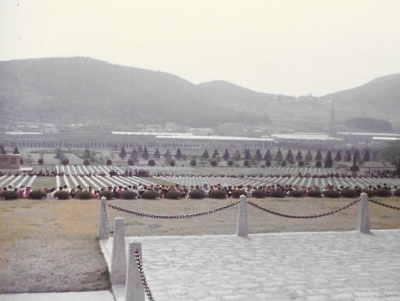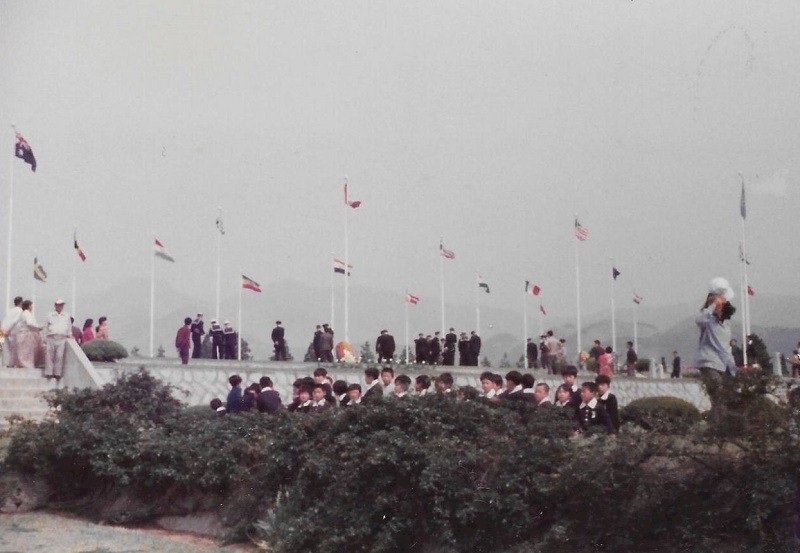 (SH453) Steve Hlasny bids farewell to Shanghai (SH454) Leaving Shanghai. Chinese Patrol boat 687 and Ex-Soviet Romeo Class submarine "patrol type" (SH455) Leaving Shanghai. Luda Class DDG 131, speed 36 knots. 1st Chinese design and build. Completed 1974 (SH456) Exercise Far Horizons 1983 - 5th leg of the trip. Port visit Pusan, Korea, 11-13 May 1983. Korean War memorial at entrance to the UN Cemetery in Pusan (SH457) Wreath laying ceremony - 13 May 1983. CPO1 Hunter, CPO2 Hlasny and Capt. George D2 lay a wreath in honour of the war dead