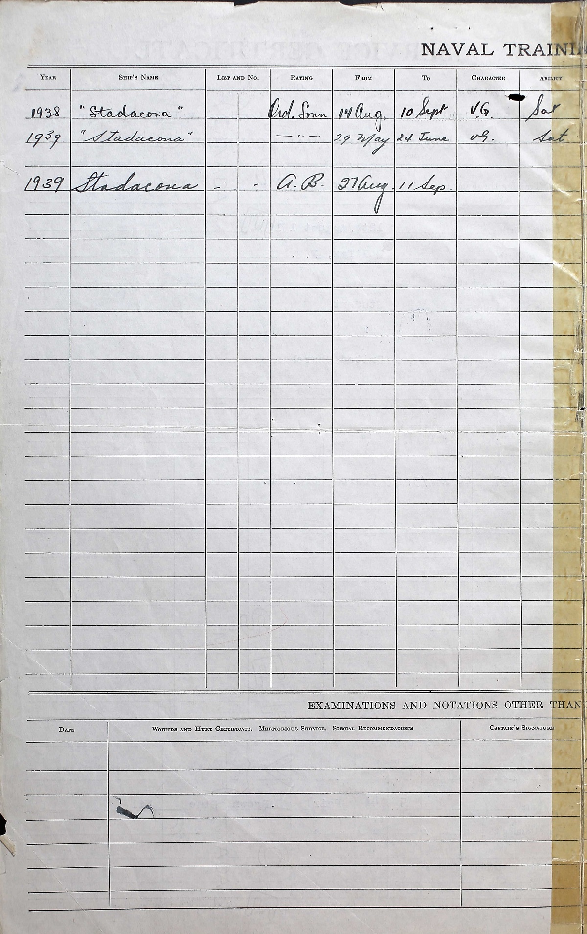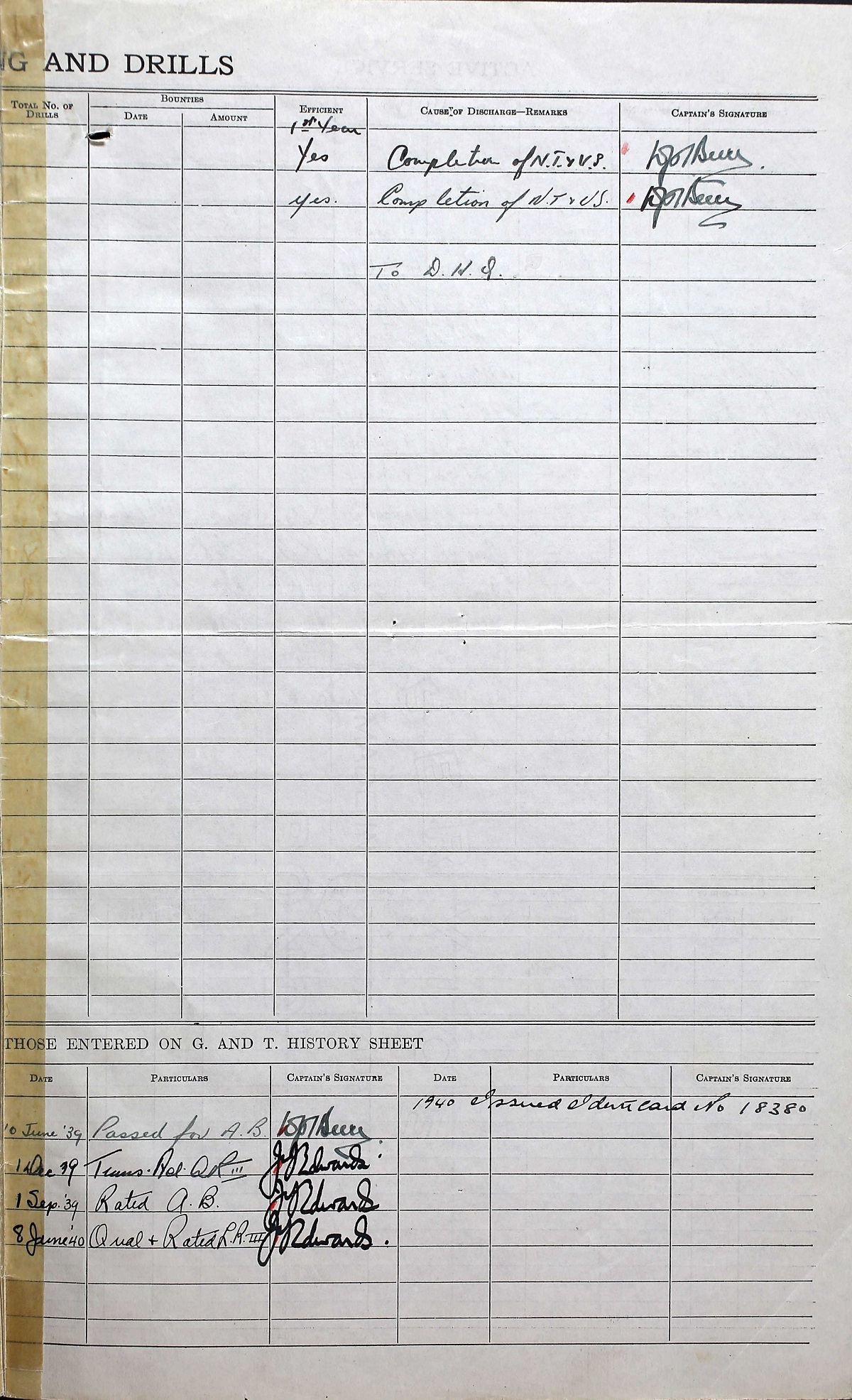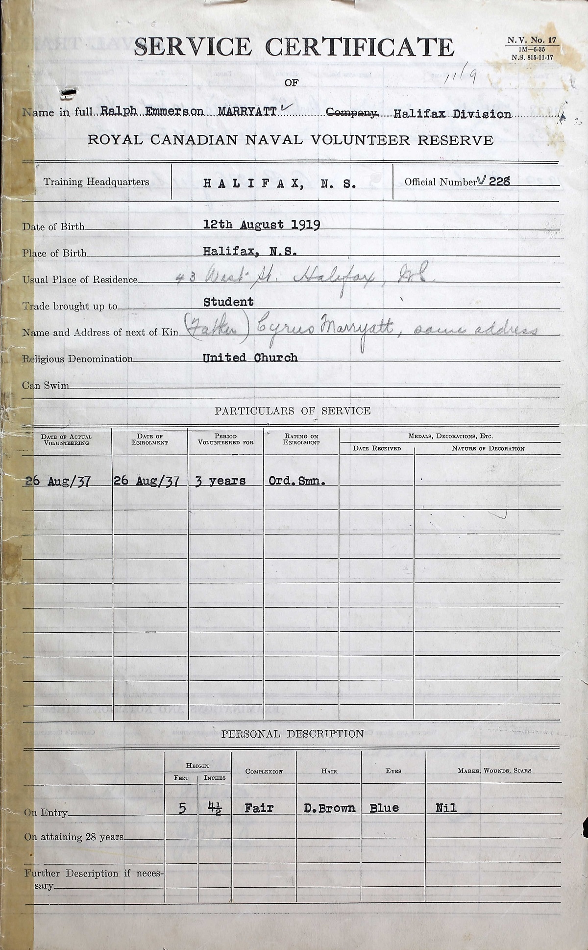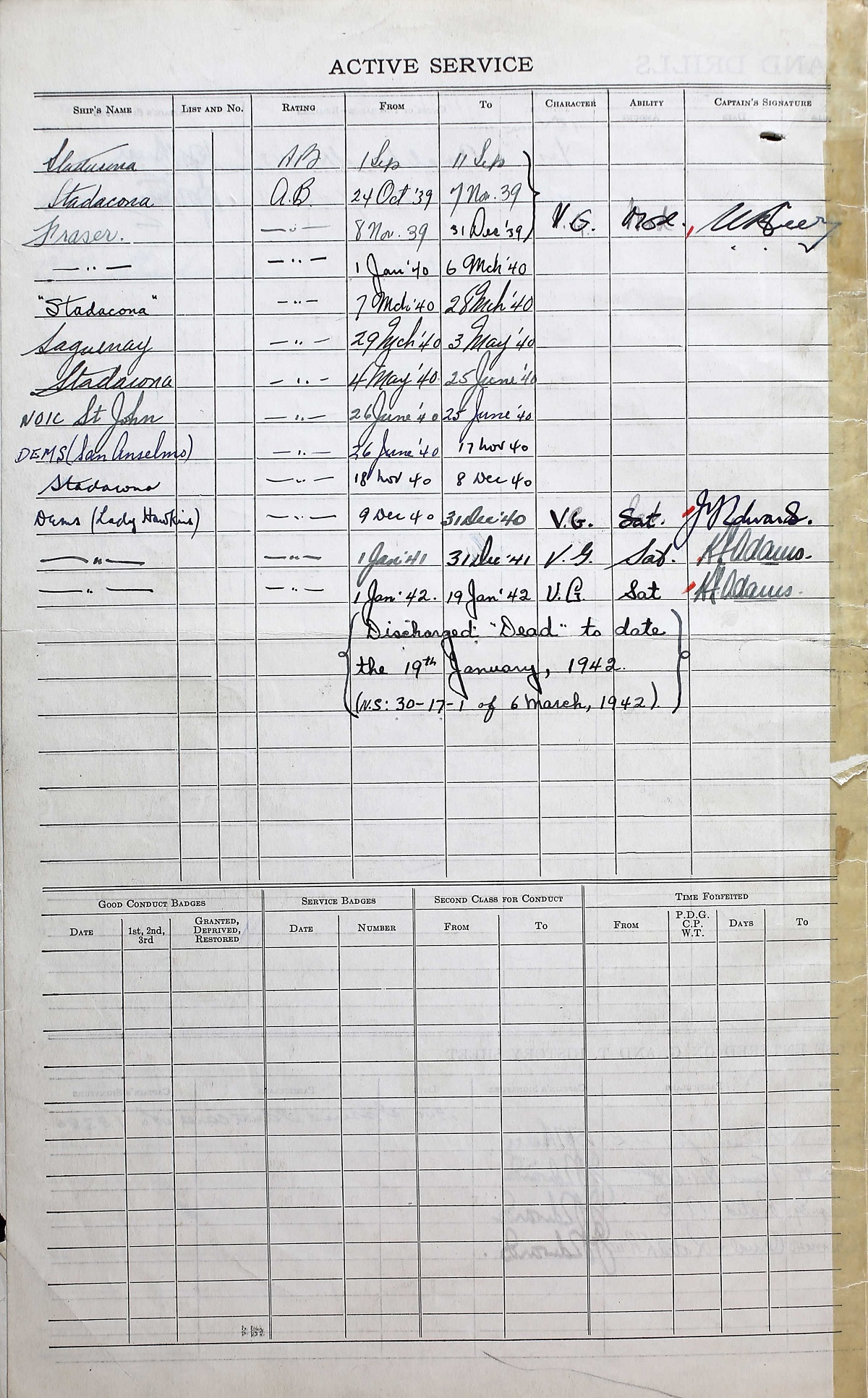 Ships served in: HALIFAX DIVISION RCNVR - Enlisted in the RCNVR 27 Aug 1917, Halifax, Nova Scotia HMCS FRASER - Served in FRASER 08 Nov 1939 - 06 Mar 1940 as an AB, RCNVR HMCS SAGUENAY - Served in SAGUENAY 29 Mar 1940 - 03 May 1940 as an AB, RCNVR DEMS SAN ANSELMO - Served in SAN ANSELMO 26 Jun 1940 - 29 Jun 1940 as an AB, RCNVR DEMS A. D. HUFF - Served in A. D. HUFF 30 Jun 1940 - 30 Jun 1940 - 15 Nov 1940 DEMS LADY HAWKINS - Drafted to LADY HAWKINS 09 Dec 1940 as an AB, RCNVR