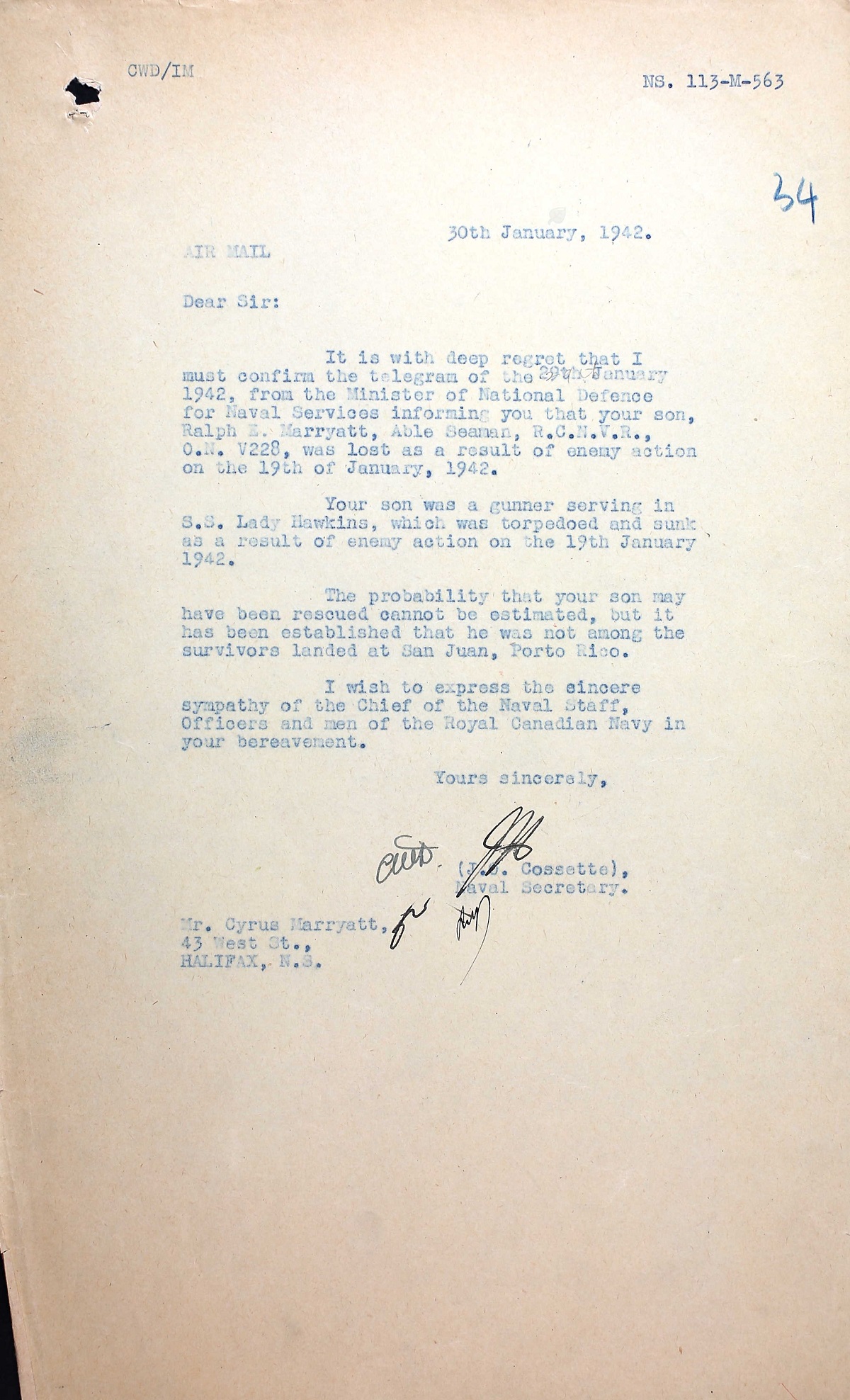 MARRYATT, Ralph Emmerson, AB, V228, RCNVR, MPK - 19 Jan 1942, SS LADY HAWKINS - Son of Cyrus S. and Mabel Edith Marryatt, of Halifax, Nova Scotia.