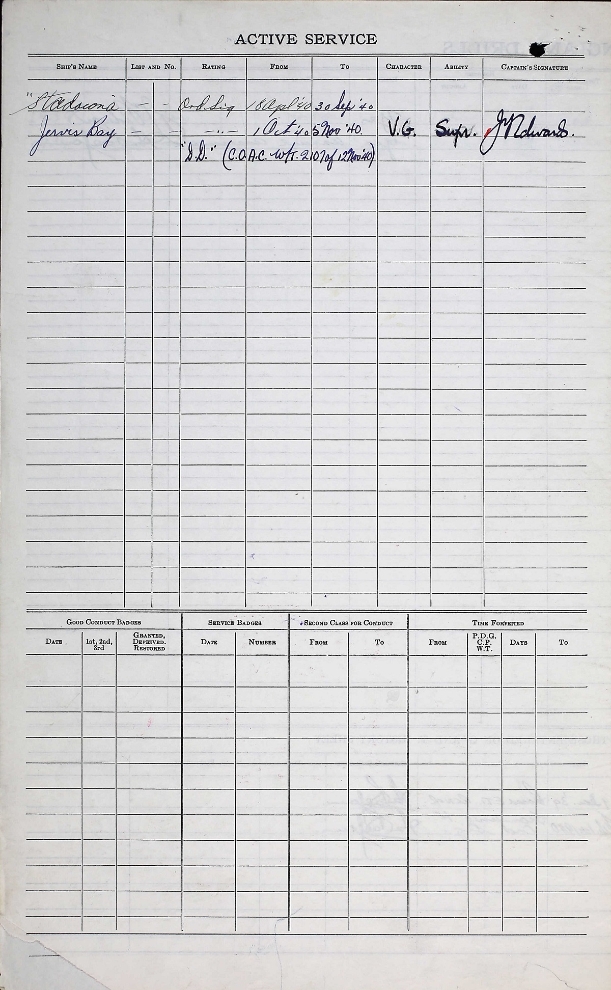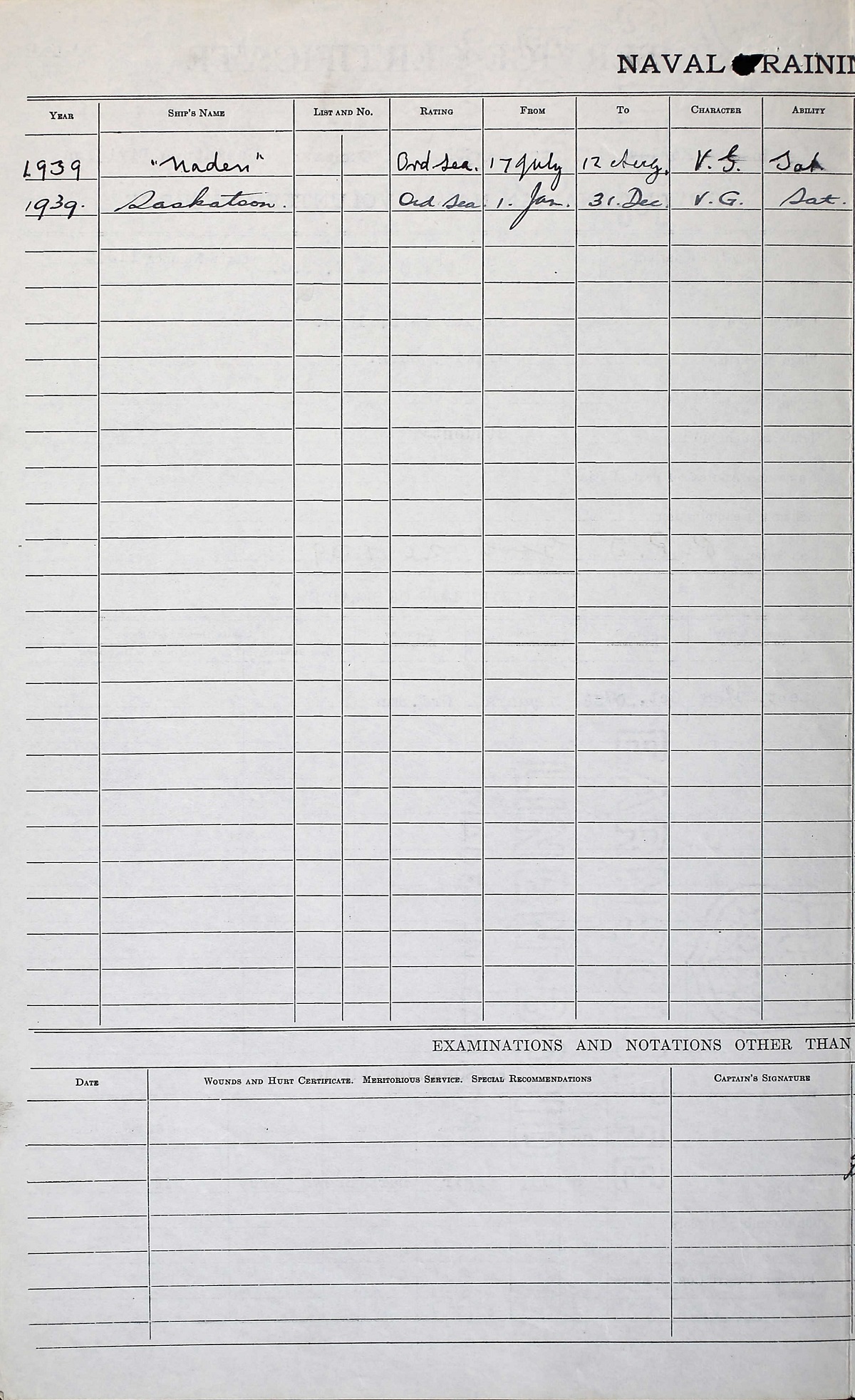 Ships served in: RCNVR DIVISION SASKATOON - Enlisted 20 Oct 1938 as an OS, RCNVR HMCS NADEN - Drafted to NADEN 15 Jul 1939 as an OS, RCNVR HMCS NOOTKA - loaned to NOOTKA from NADEN 31 Jul 1939 - 11 Aug 1939 for training * Rated O/Sig, RCNVR 11 Feb 1940 HMCS STADACONA - Drafted to STADACONA 14 Apr 1940 HMCS JERVIS BAY - Drafted to JERVIS BAY 01 Oct 1940 as an O/Sig, RCNVR