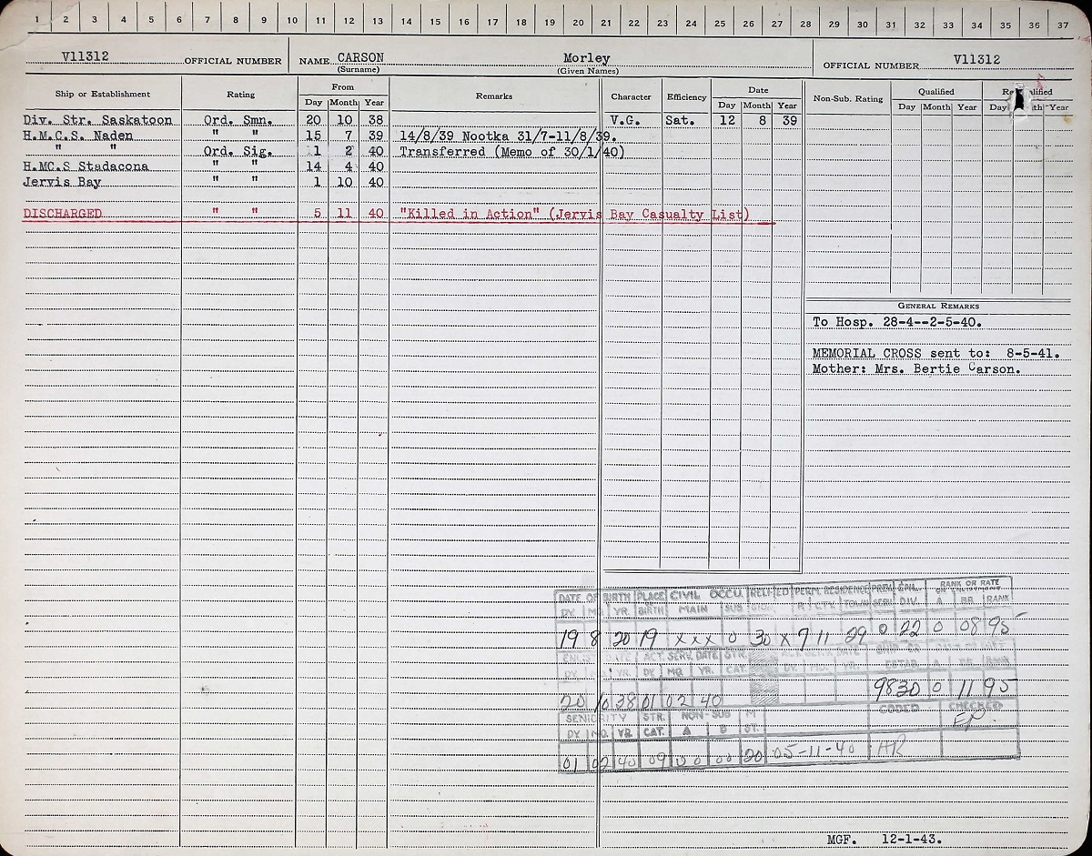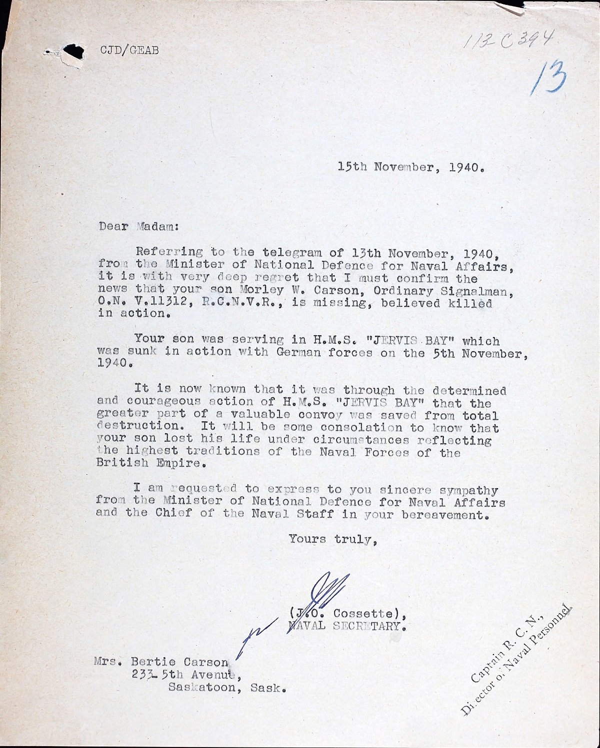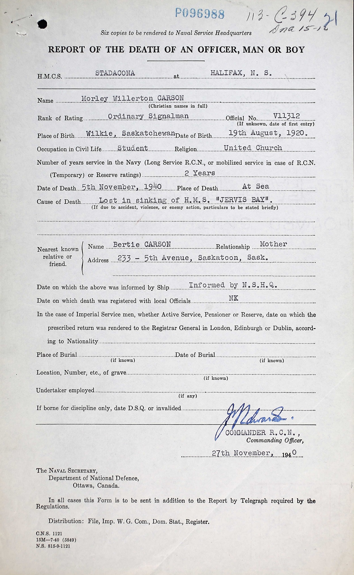 CARSON, Morley Willerton, O/Sig, V11312, RCNVR, MPK - 05 Nov 1940, HMS JERVIS BAY - Son of Mrs. Bertie Carson, of Saskatoon, Saskatchewan.