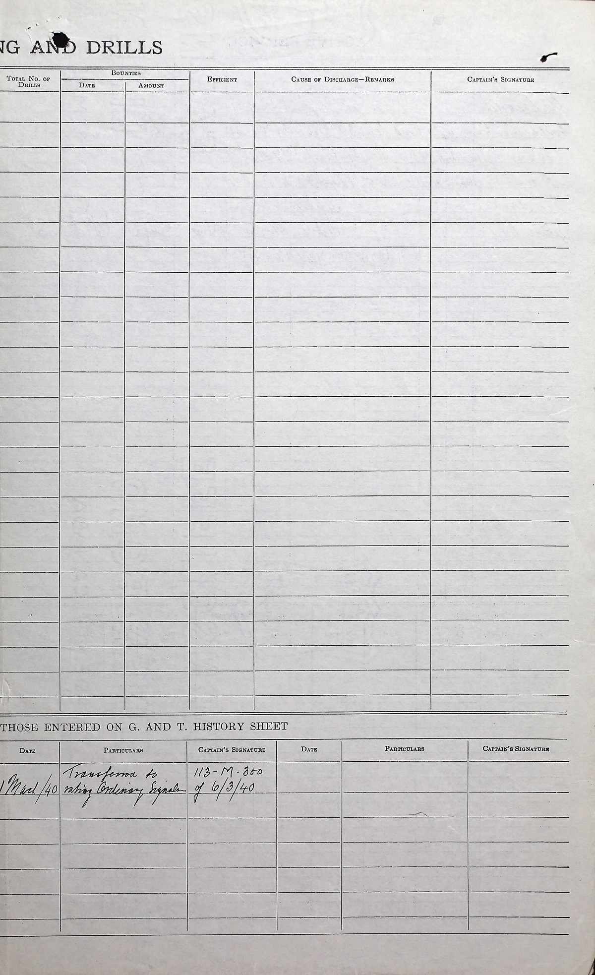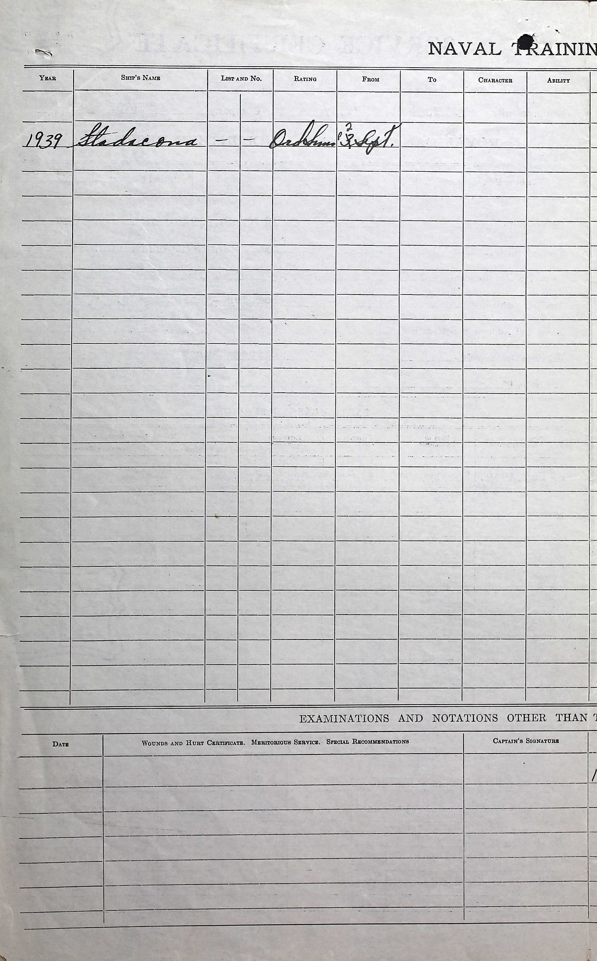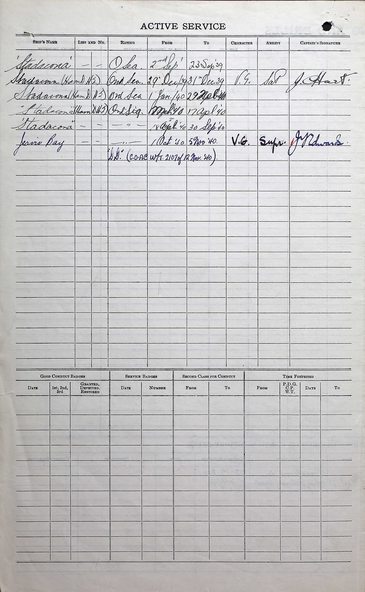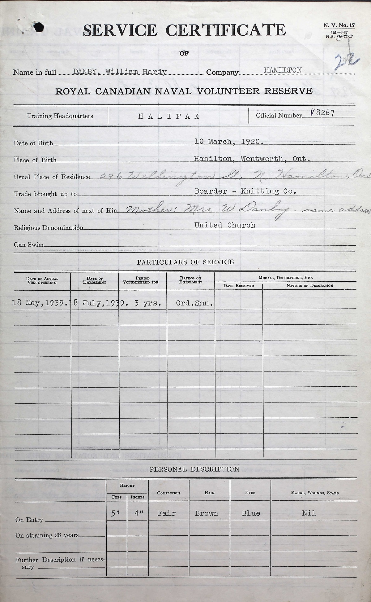 Ships served in: RCNVR DIVISION HAMILTON - Enlisted 18 Jul 1939. Commenced Active Service 29 Dec 1939 HMS JERVIS BAY - Drafted to JERVIS BAY 11 Nov 1940 as an O/Sig, RCNVR