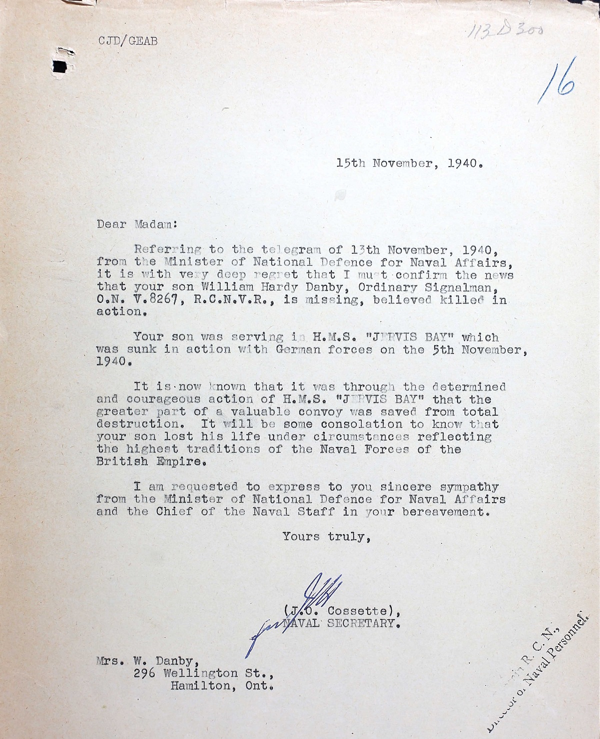 DANBY, William Hardy, Sig, V8267, RCNVR, MPK - 05 Nov 1940, HMS JERVIS BAY - Son of Wilfred and Jamesina H. Danby, of Hamilton, Ontario.