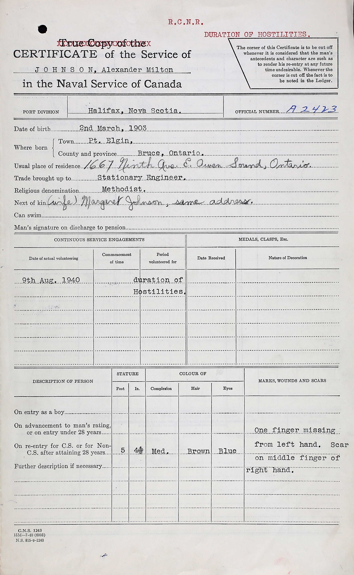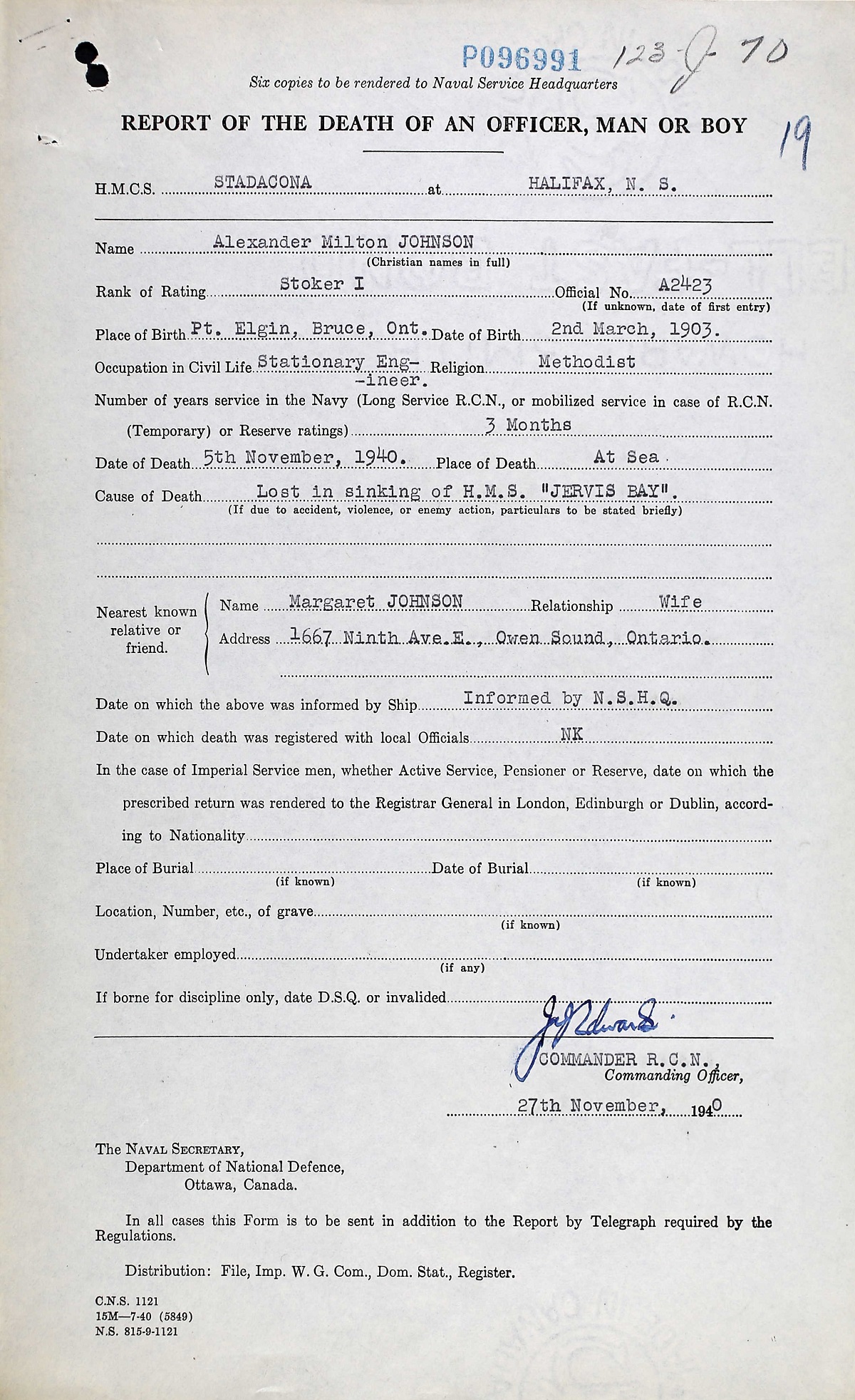 JOHNSON, Alexander Milton, Sto 1c, A2423, RCNR, MPK - 05 Nov 1940, HMS JERVIS BAY - Son of George and Elizabeth B. Johnson; husband of Margaret Johnson, of Owen Sound, Ontario.