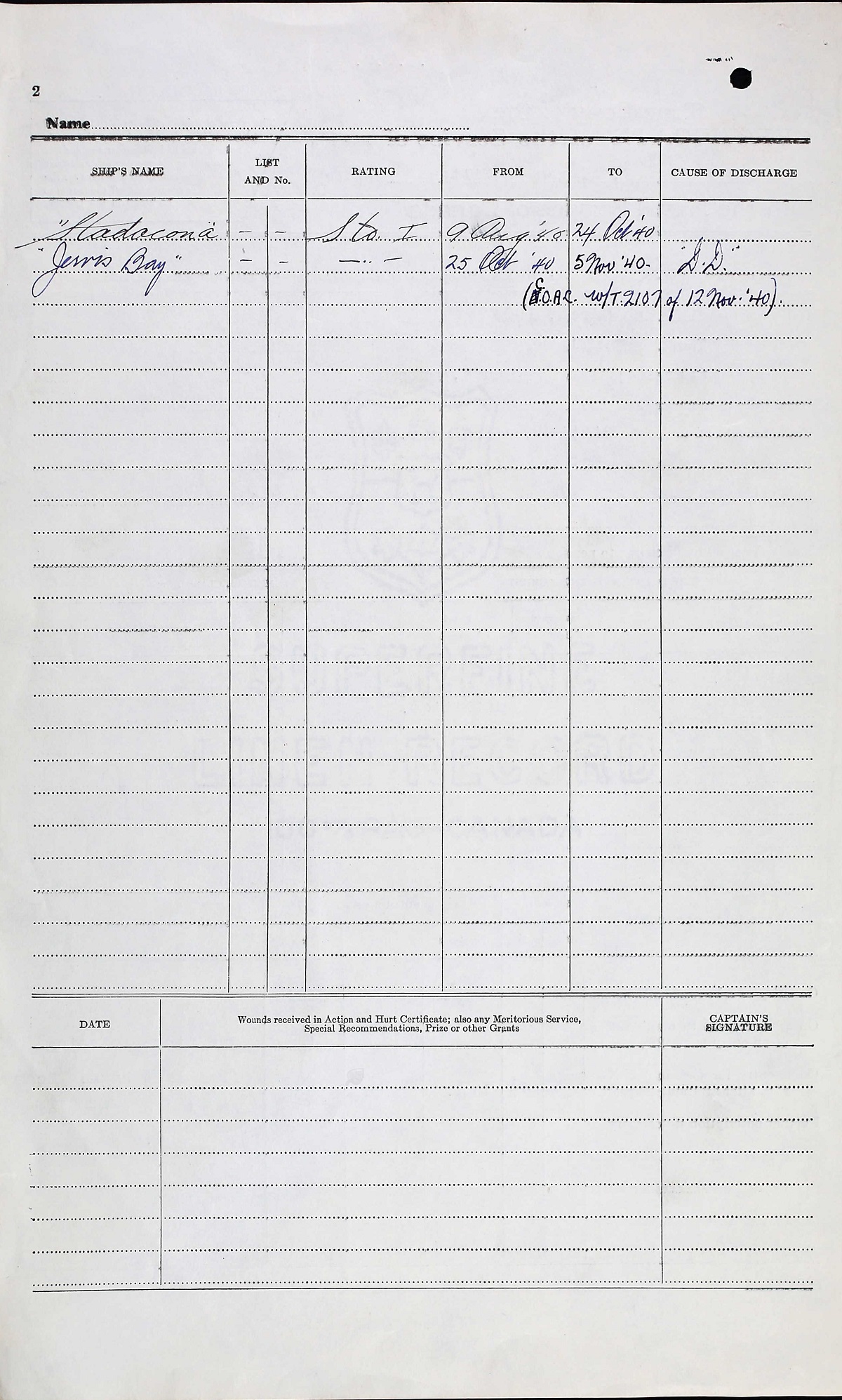 Ships served in: HMCS STADACONA - Enlisted 09 Aug 1940 as a Sto 1c, RCNR HMS JERVIS BAY - Drafted to JERVIS BAY 25 Oct 1940 as a Sto 1c, RCNR