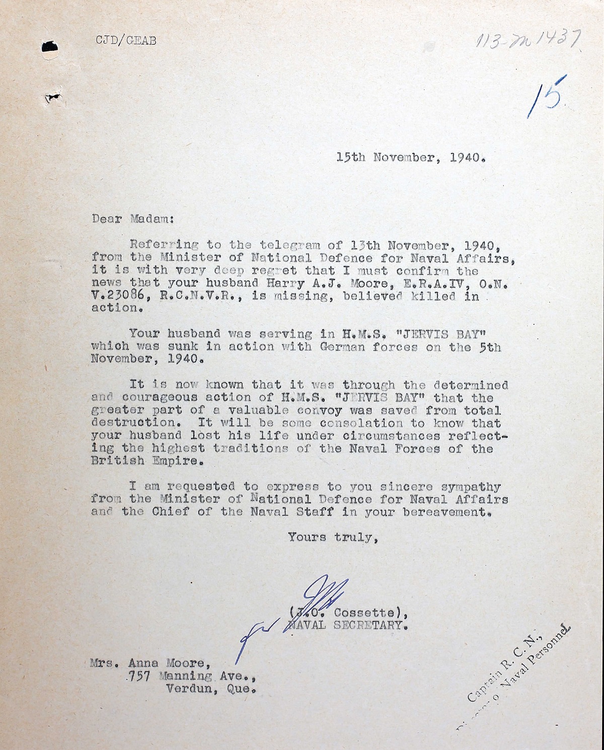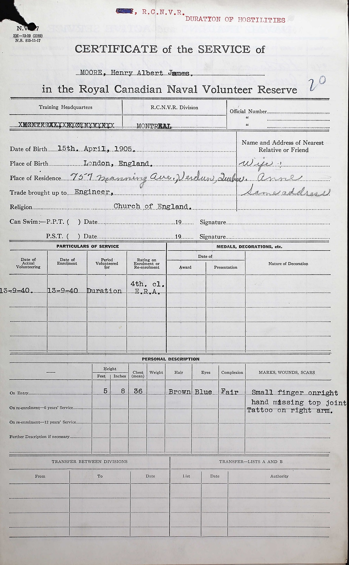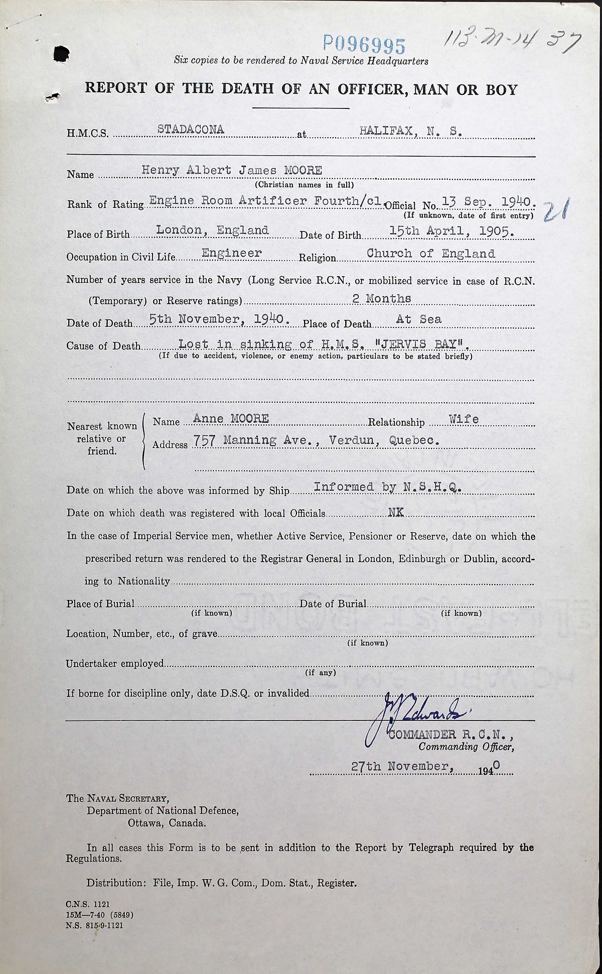 MOORE, Henry Albert James, ERA 4c, V23086, RCNVR, MPK 05 Nov 1940, HMS JERVIS BAY - Son of Margaret Moore, of Carlisle, England. Husband of Anna G. Moore, of Verdun, Quebec.