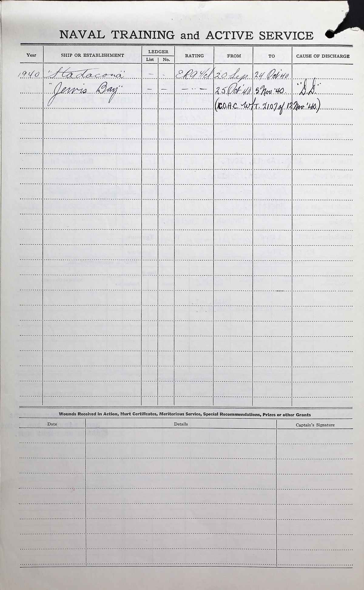 Ships served in: MONTREAL DIVISION RCNVR - Enlisted 13 Sep 1940. Commenced Active Service 18 Sep 1940 as an ERA 4c, RCNVR HMCS STADACONA - Drafted to STADACONA 19 Sep 1940 as an ERA 4c, RCNVR HMS JERVIS BAY - Drafted to JERVIS BAY 25 Oct 1940 as an ERA 4c, RCNVR
