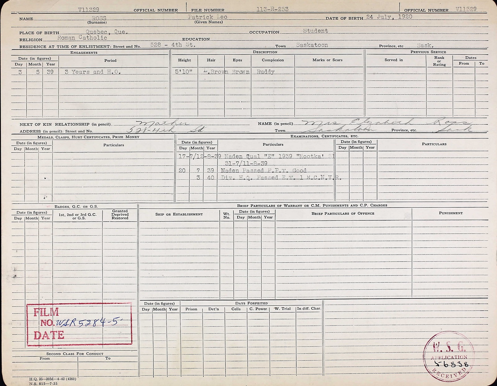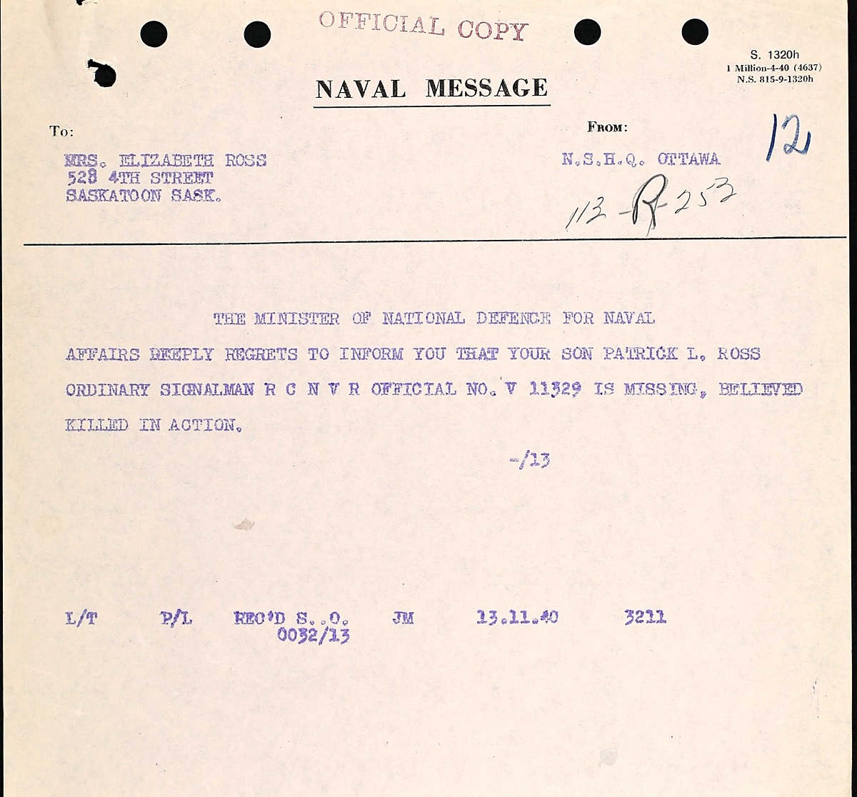 Ordinary Signalman Patrick Leo Ross of Saskatoon, Saskatchewan was the son of Harrison L. and Elizabeth Ross who came from Québec, where Patrick was born. Patrick was a student when he enlisted on March 03, 1939 at Saskatoon, Saskatchewan.