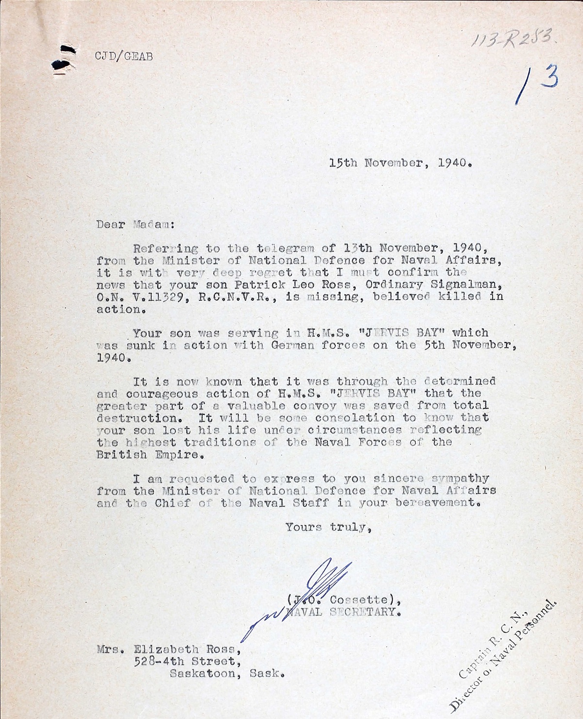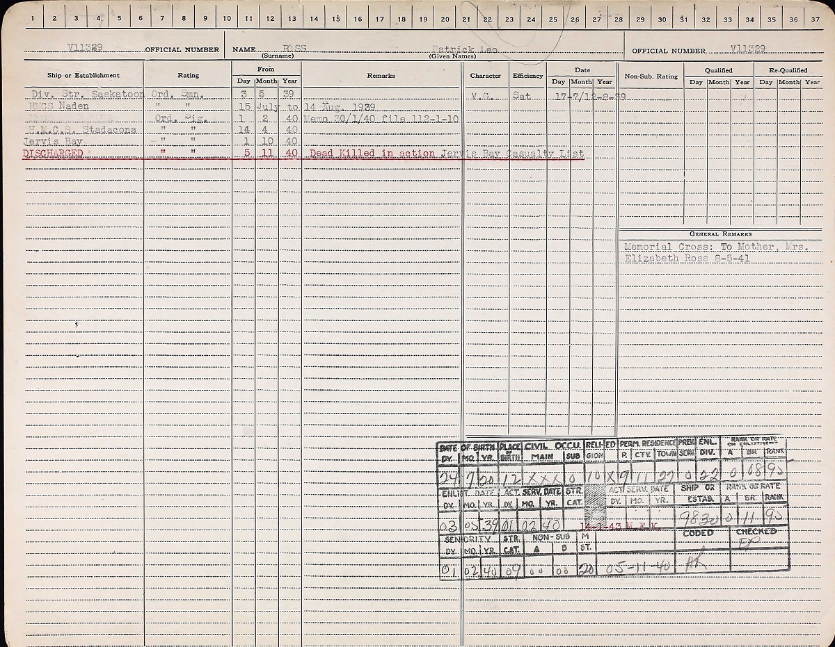 ROSS, Patrick Leo, O/Sig, V11329, RCNVR, MPK - 05 Nov 1940, HMS JERVIS BAY - Son of Harrison L. and Elizabeth Ross, of Saskatoon, Saskatchewan.