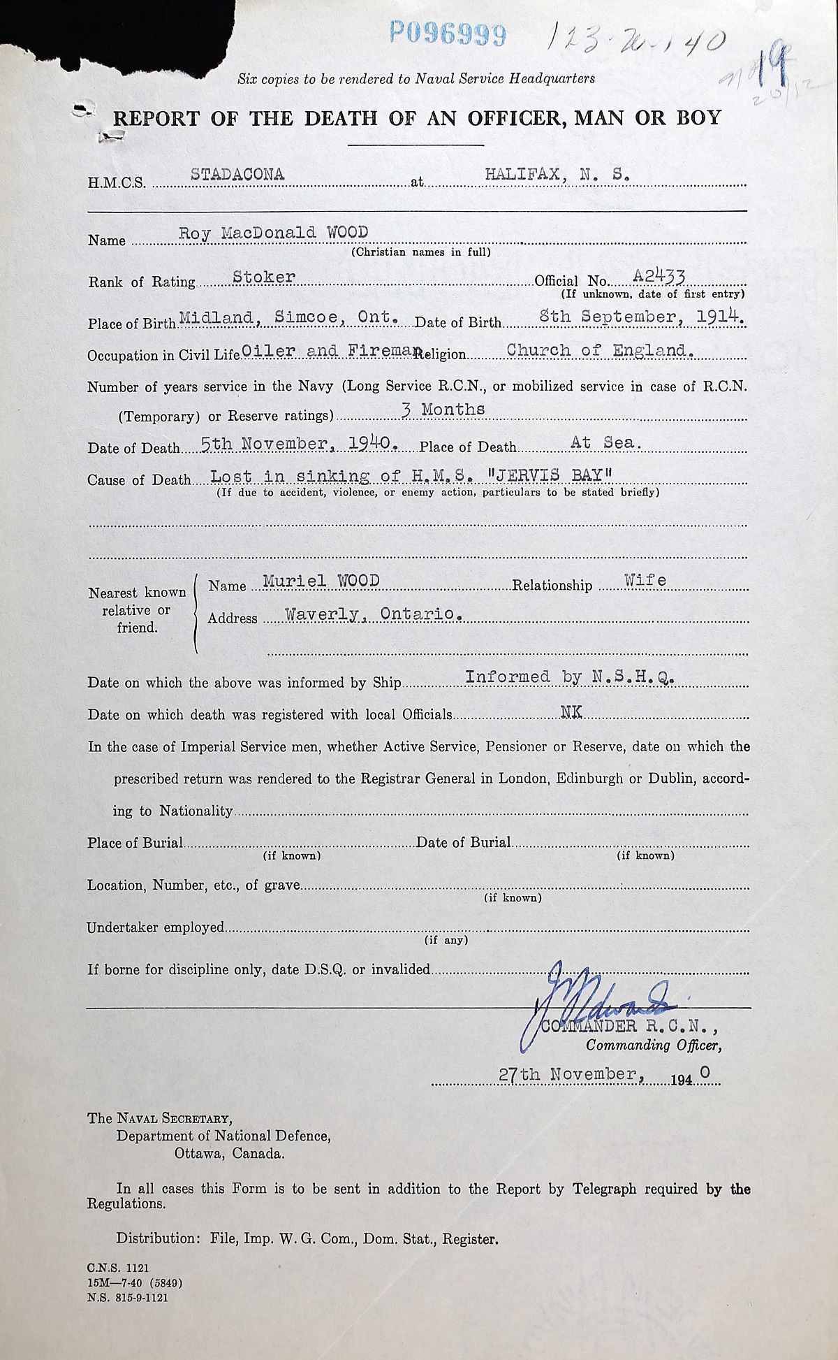 WOOD, Roy Macdonald, Sto 1c, A2433, RCNR, MPK - 05 Nov 1940, HMS JERVIS BAY - Son of John Lindsay Wood and Elizabeth Edith A. Wood, of Waverley, Ontario; husband of Muriel Esther Wood, of Elmdale, Ontario.