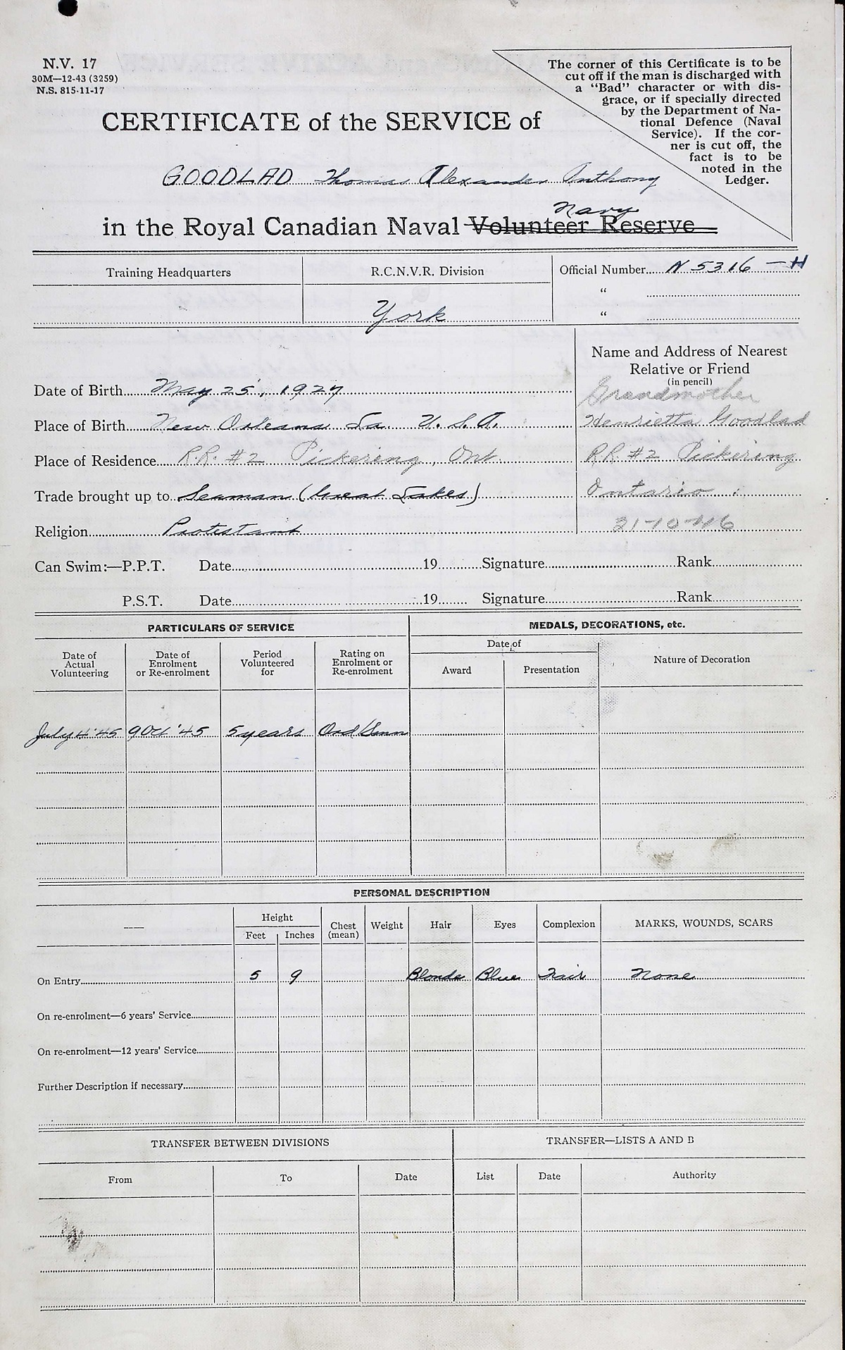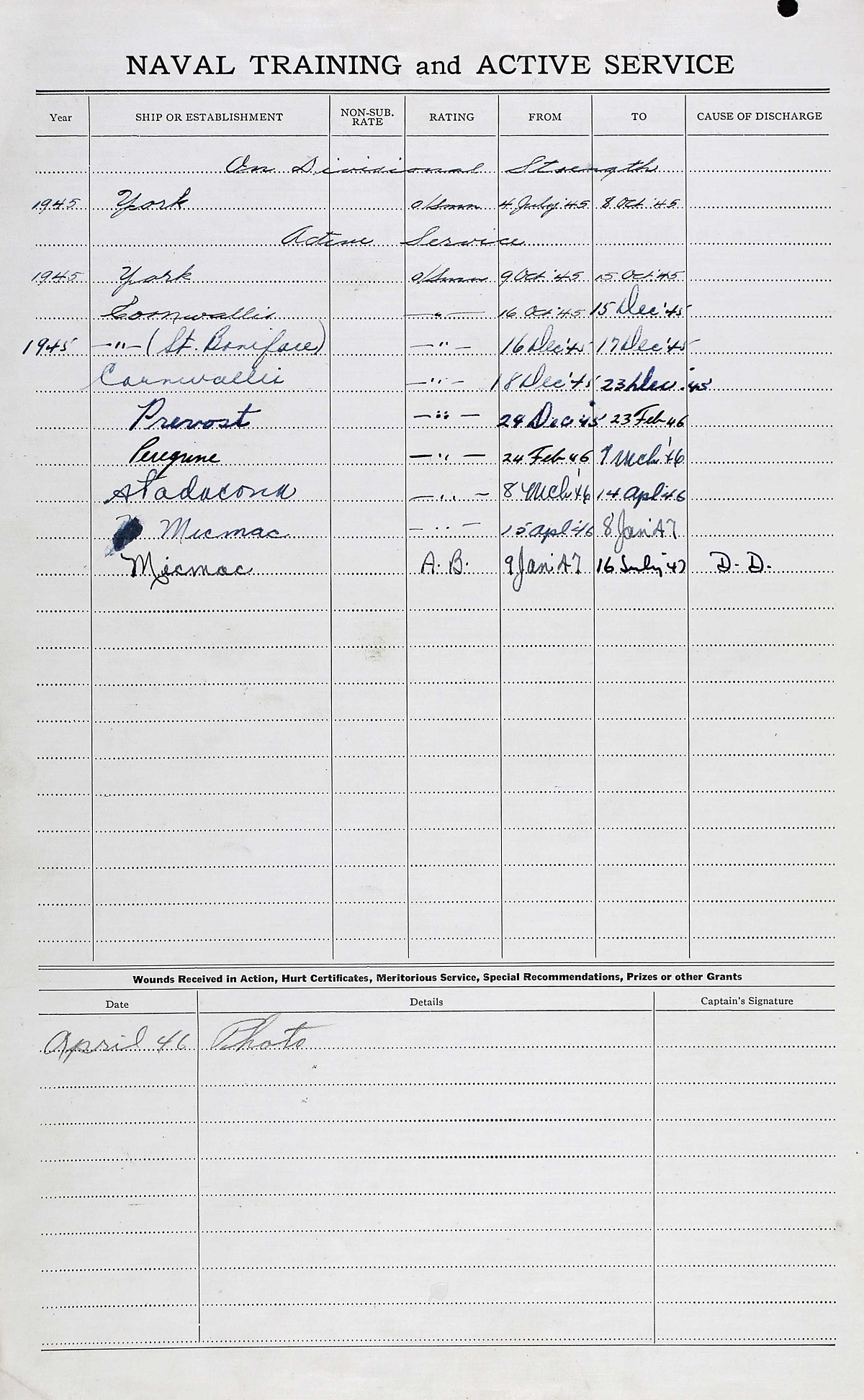 Ships served in: HMCS YORK - Enlisted 04 Jul 1945. Commenced Service 09 Oct 1945 HMCS ST BONIFACE - Served in ST BONIFACE 16 Dec 1945 - 17 Dec 1945 while in training at HMCS CORNWALLIS HMCS MICMAC - Drafted to MICMAC 15 Apr 1946 as an OS, RCN. Rated AB 09 Jan 1947