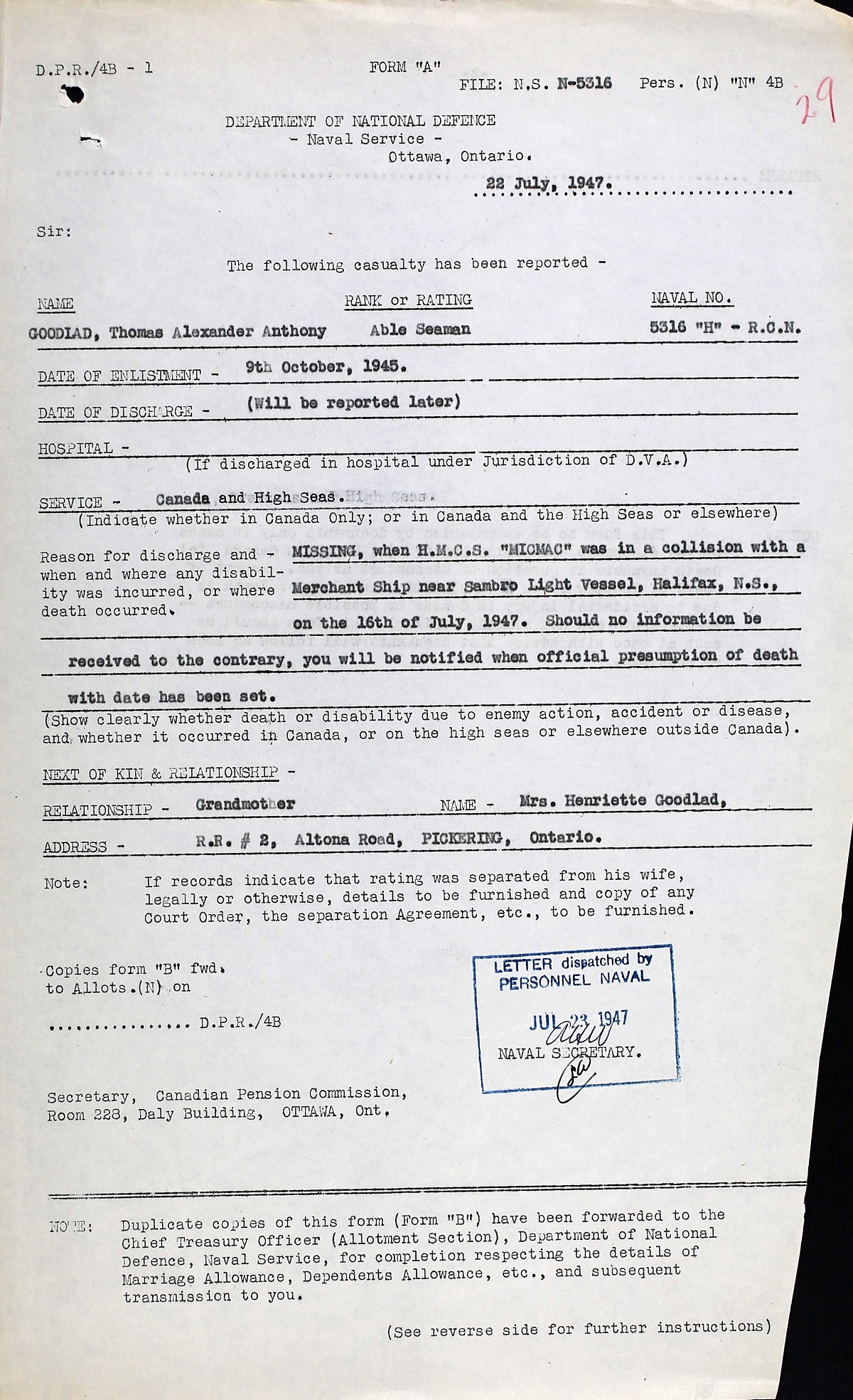 GOODLAD, Thomas Alexander Anthony, AB, 5316-H, RCN, MPK - 16 Jul 1947, HMCS MICMAC - Son of Robert and Evelyn Goodlad, of Vancouver, British Columbia. Grandson of Henrietta Goodlad, of Pickering, Ontario.