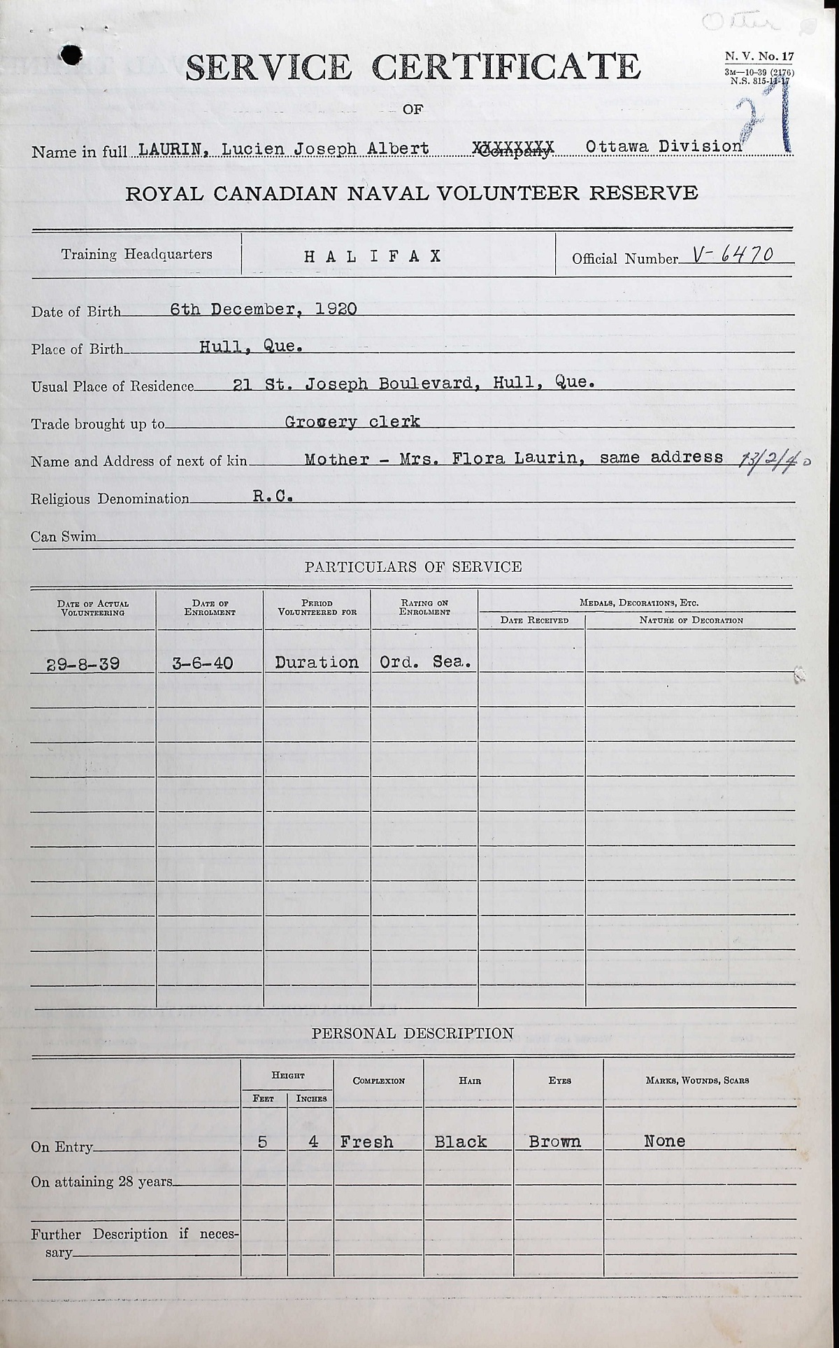 (LL01) Seaman Lucien Laurin at RCNVR DIV OTTAWA (LL02) LR III Lucien Laurin (LL03-LL04) Certificate of Service pages 1 & 4 (LL05) Report of Death