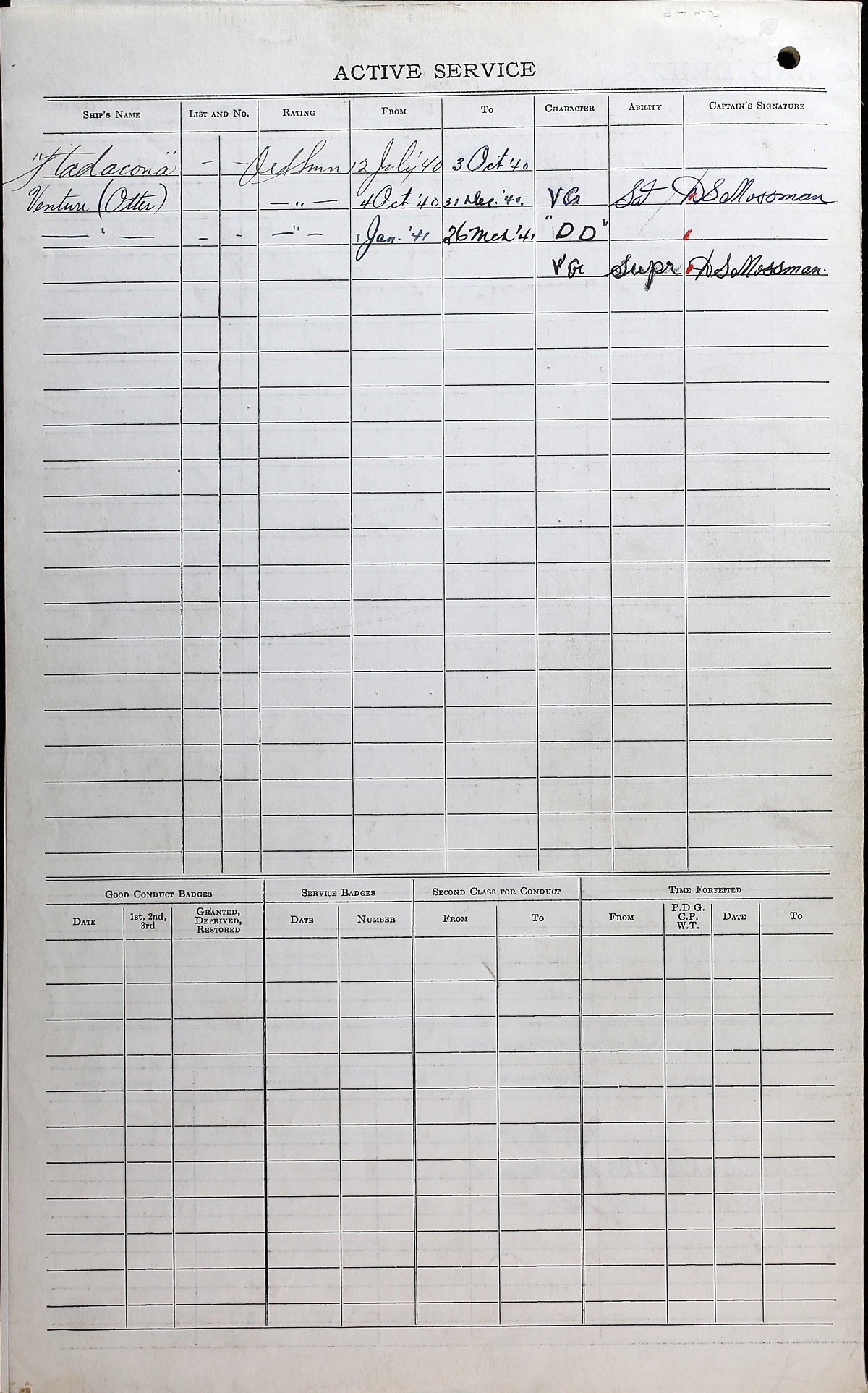 Ships served in: OTTAWA DIVISION RCNVR - Enlisted 03 Jun 1940. Commenced Active Service 10 Jul 1940. HMCS STADACONA - Drafted to STADACONA 12 Jul 1940 *Rated LR III 28 Sep 1940 HMCS OTTER - Drafted to OTTER 04 Oct 1940 as a LR III, RCNVR