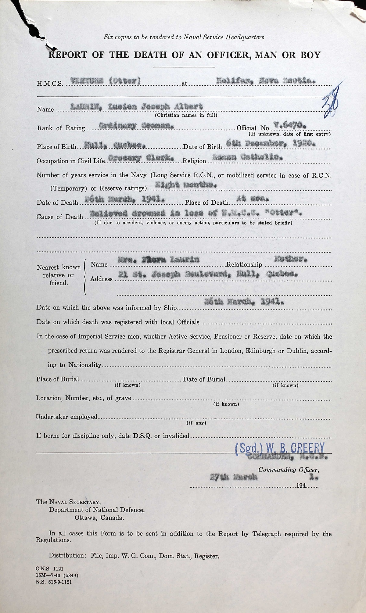 LAURIN, Lucien Joseph Albert, OS, V6470, RCNVR, MPK - 26 Mar 1941, HMCS OTTER - Son of Adelard and Flora Laurin, of Hull, Quebec.