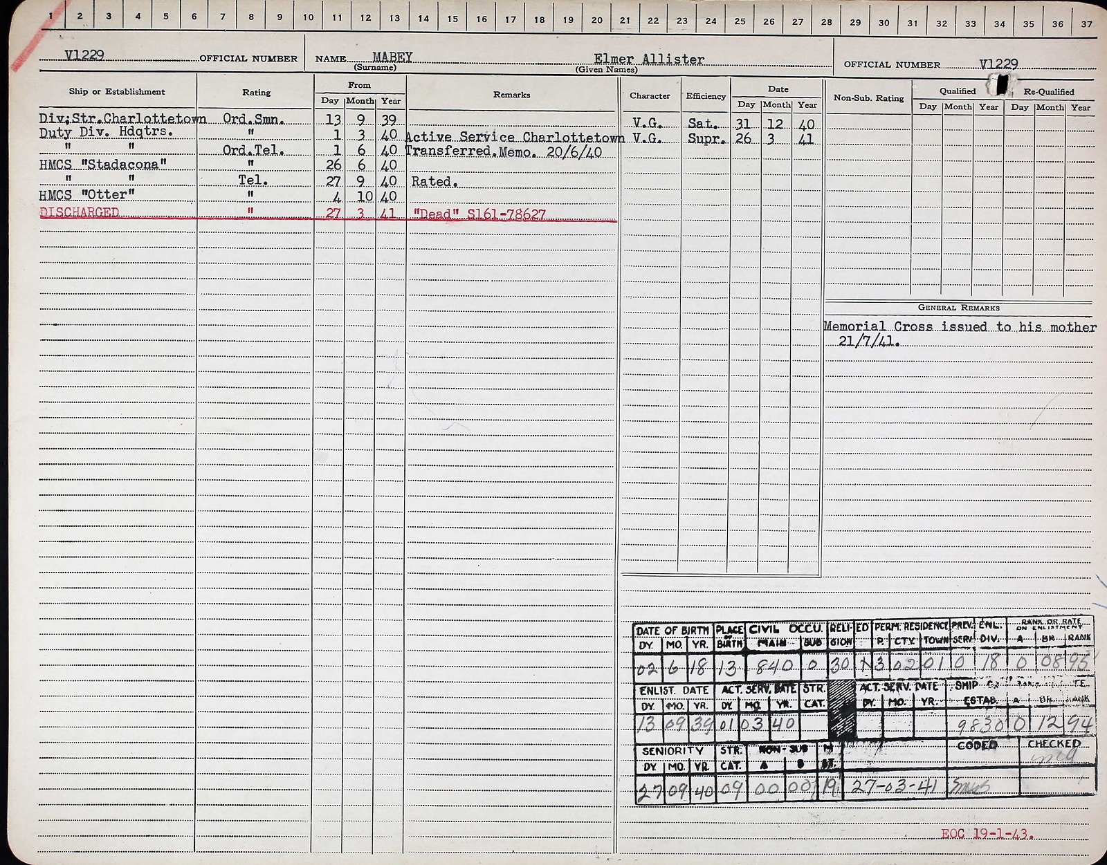 MABEY, Elmer Allister, Tel, V1229, RCNVR, MPK - 26 Mar 1941, HMCS OTTER - Son of Albert and Ellen Mabey, of Victoria, Prince Edward Island.