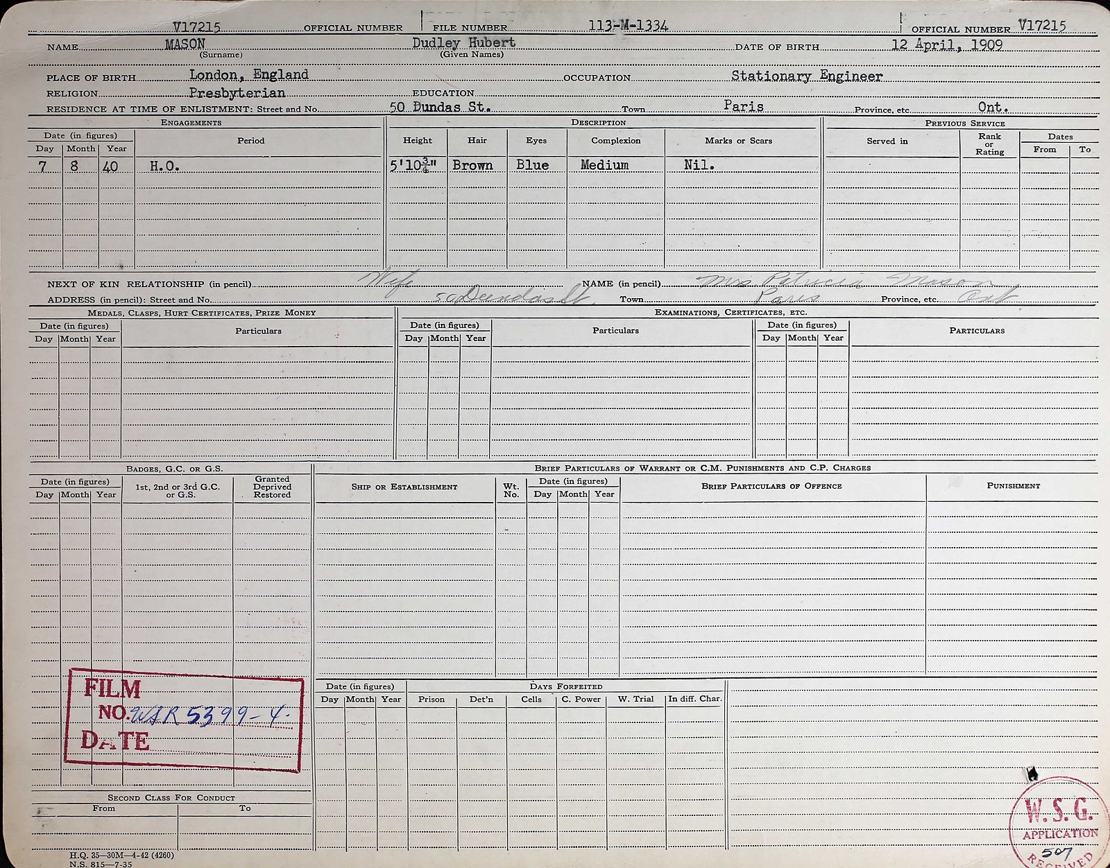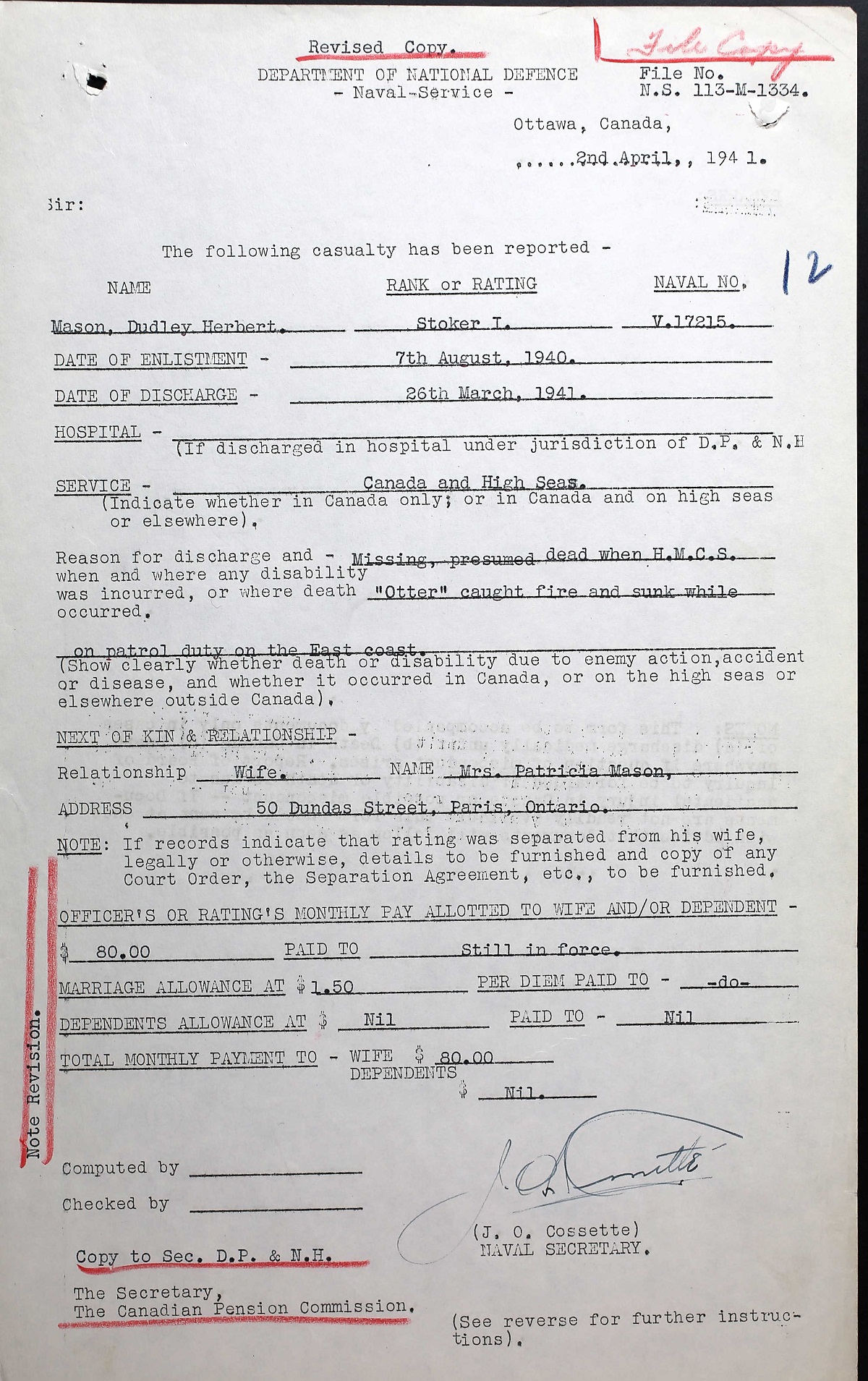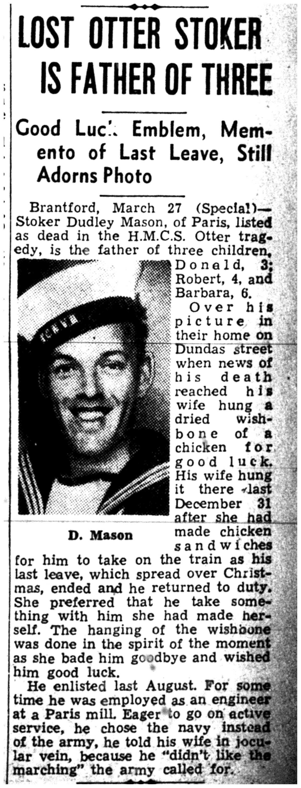 MASON, Dudley Herbert, Sto 1c, V17215, RCNVR, MPK - 26 Mar 1941, HMCS OTTER - Son of Robert and Ellen Mason; husband of Patricia Ellen F: Mason, all of Paris, Ontario.